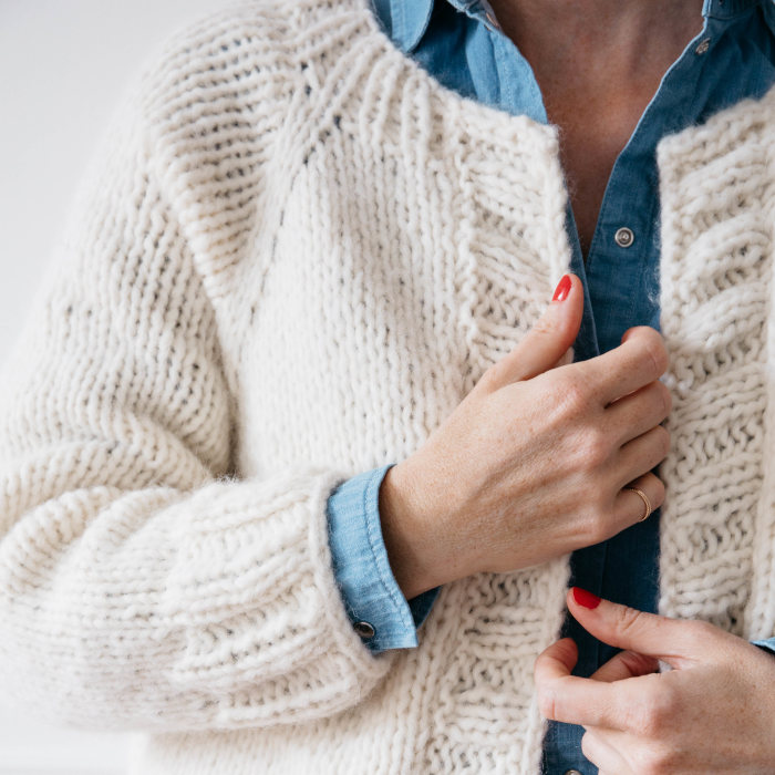 Une veste tendance et intemporelle, qui se tricote de haut en bas.