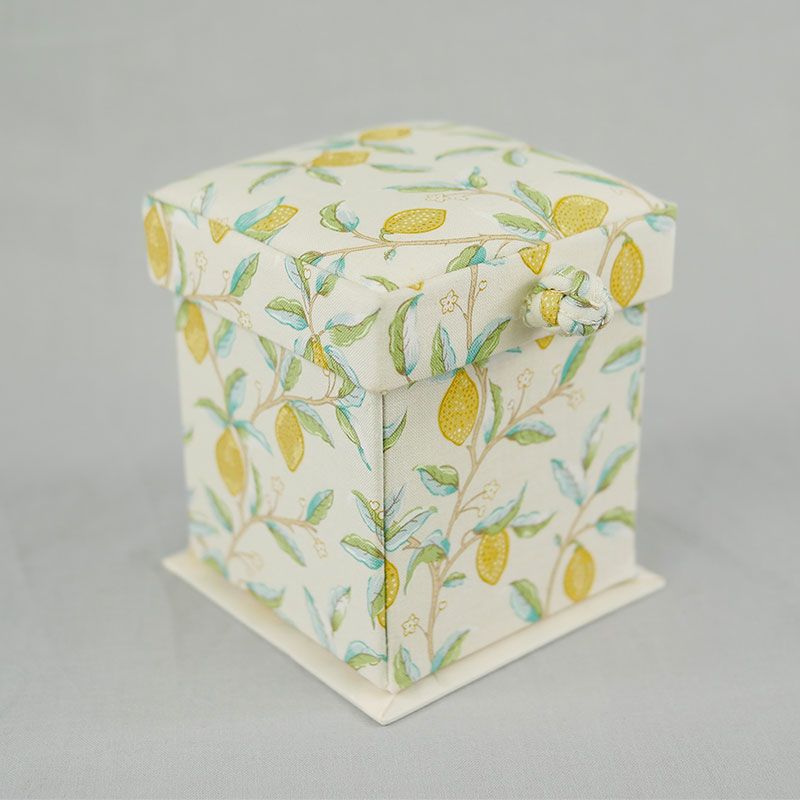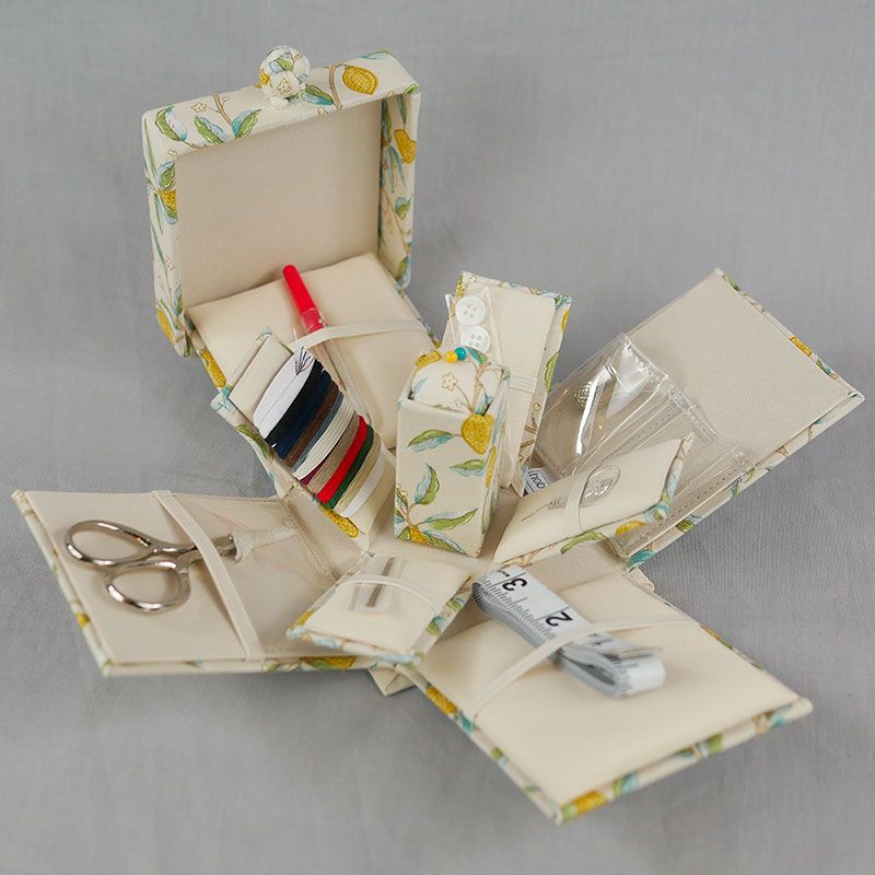 Ce coffret est recouvert d'un tissu beige à motifs de citrons, et contient les outils indispensables pour la couture : ciseaux, aiguilles, mètre ruban, dé à coudre, découd-vite, boutons, fils, enfile-aiguilles, coussin pour épingles.