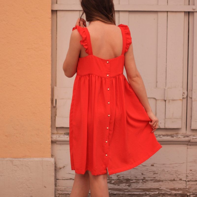 Avec sa coupe courte, son haut ajusté, ses bretelles à volants et sa jupe froncée, elle offre un look romantique et ensoleillé, idéal pour la belle saison.