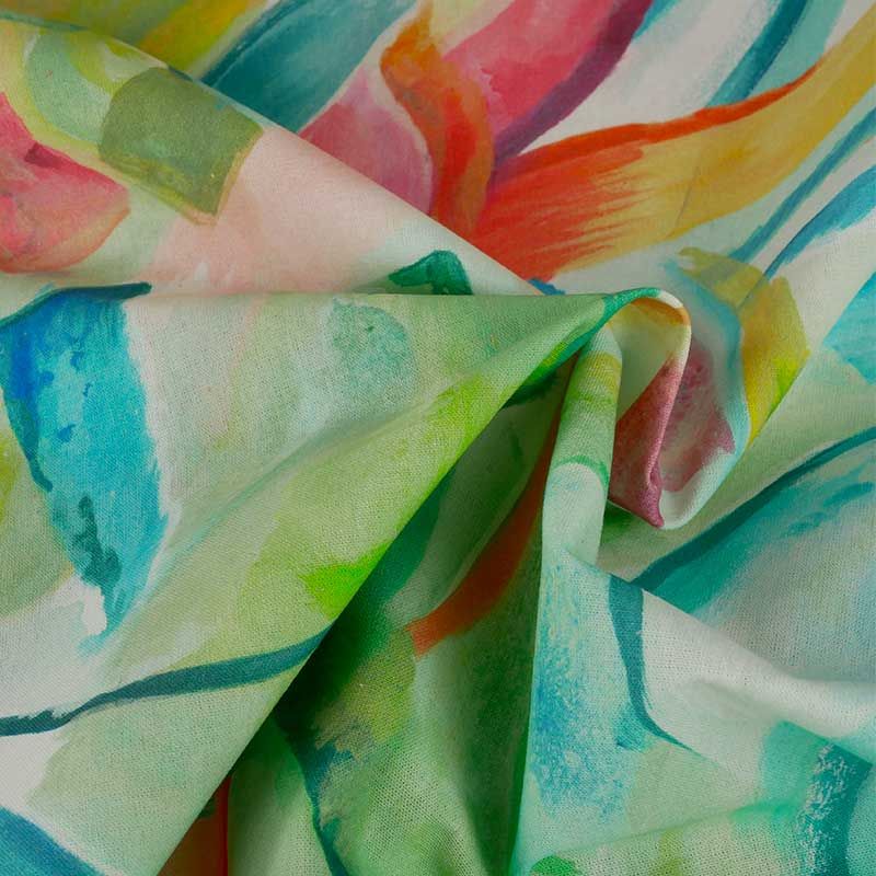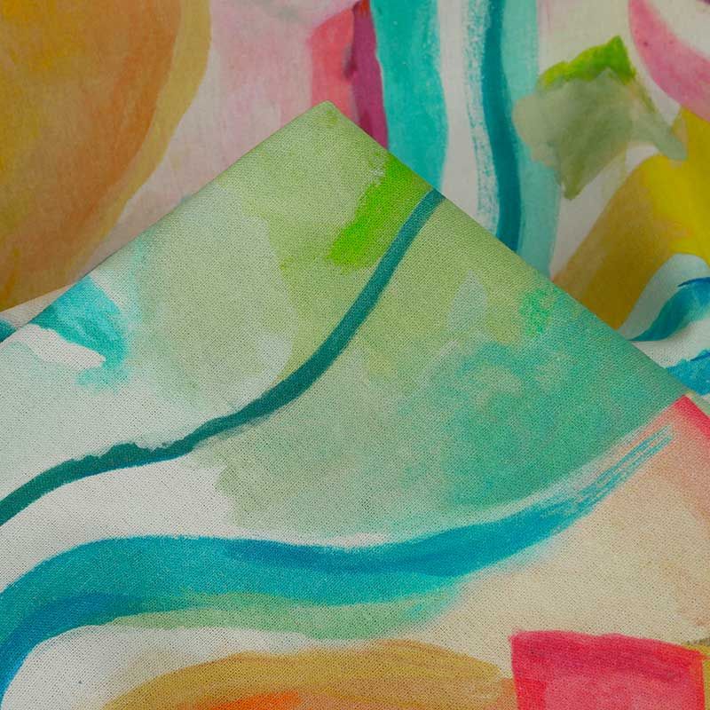 Laissez vous séduite par cette superbe toile de coton, appelée bachette. Elle offre un imprimé abstrait et pictural, dans une gamme de teintes douces et harmonieuses : du vert, du bleu, du céladon, du rose pastel, du jaune...