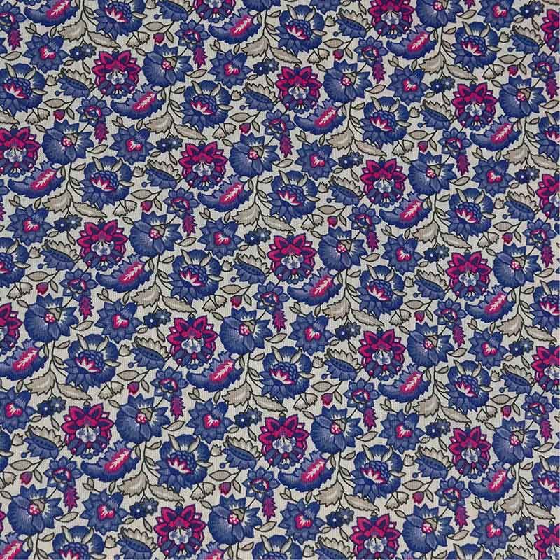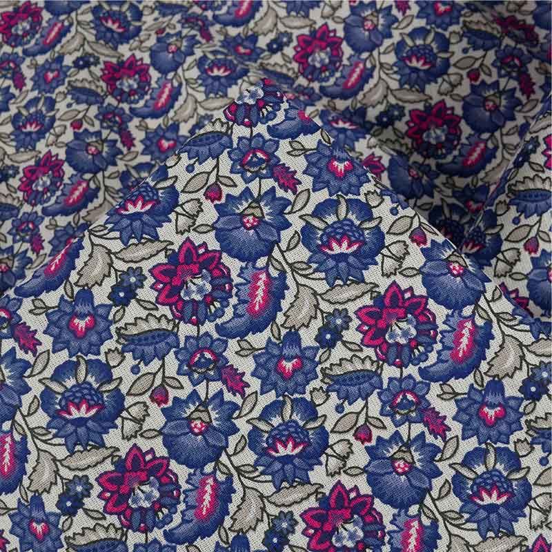 Très jolie toile en coton, parfaite pour mettre de la couleur dans votre intérieur ou pour accessoires. Sur fond blanc, le tissu est tapissé de fleurs à l'esprit indien, dans les tons bleu cobalt, rose fuchsia et gris clair.