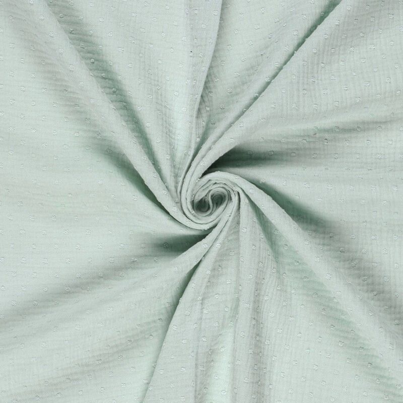 Difficile de résister à ce tissu double gaze plumetis couleur vert de gris à la fois frais doux et plein de charme. Sa couleur délicate évoque immédiatement le printemps tandis que les petits pois en relief apportent une touche romantique.