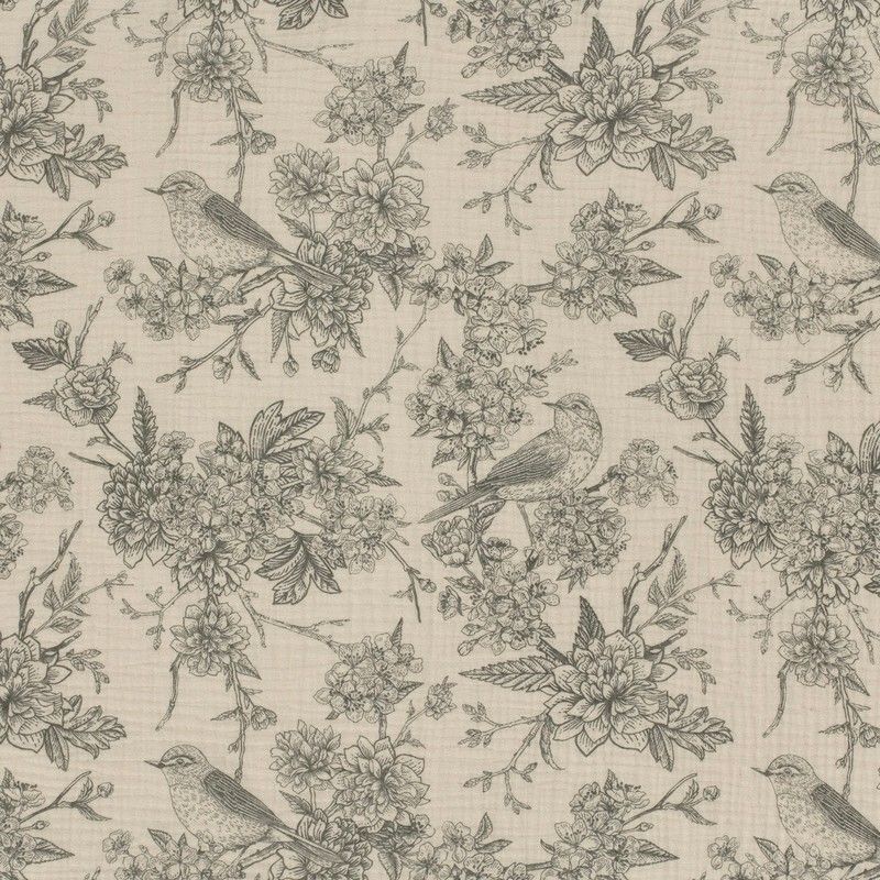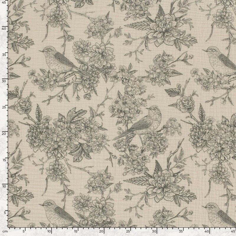 Double gaze 100% coton, inspirée du motif traditionnel de la toile de Jouy. Un imprimé délicat, couleur gris sur fond écru nude. Un grand motif végétal et floral, dans lequel se cachent quelques oiseaux.