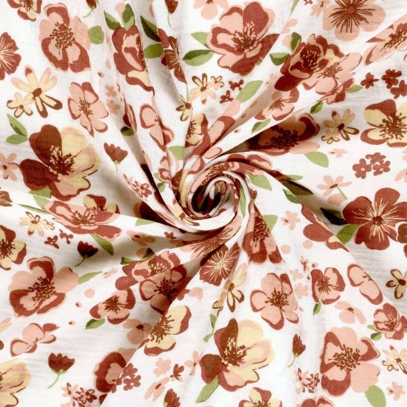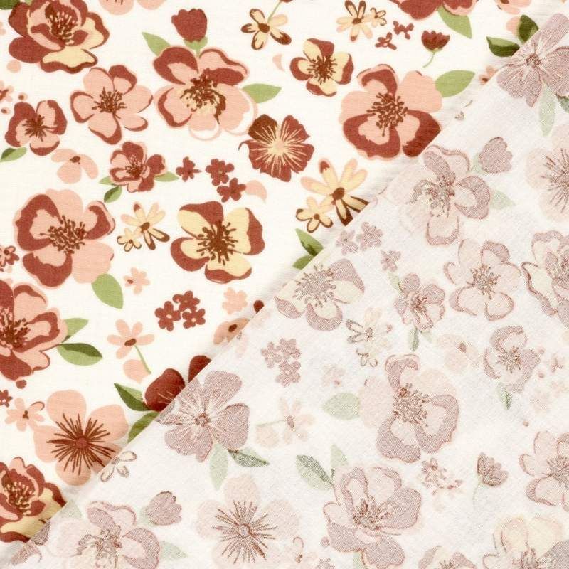 Craquez pour cette très belle double gaze 100% coton à fleurs. Sur fond blanc cassé, ce imprimé pivoines propose un mélange tout doux de rose poudré, écru, rouge tomette, marron et vert clair.