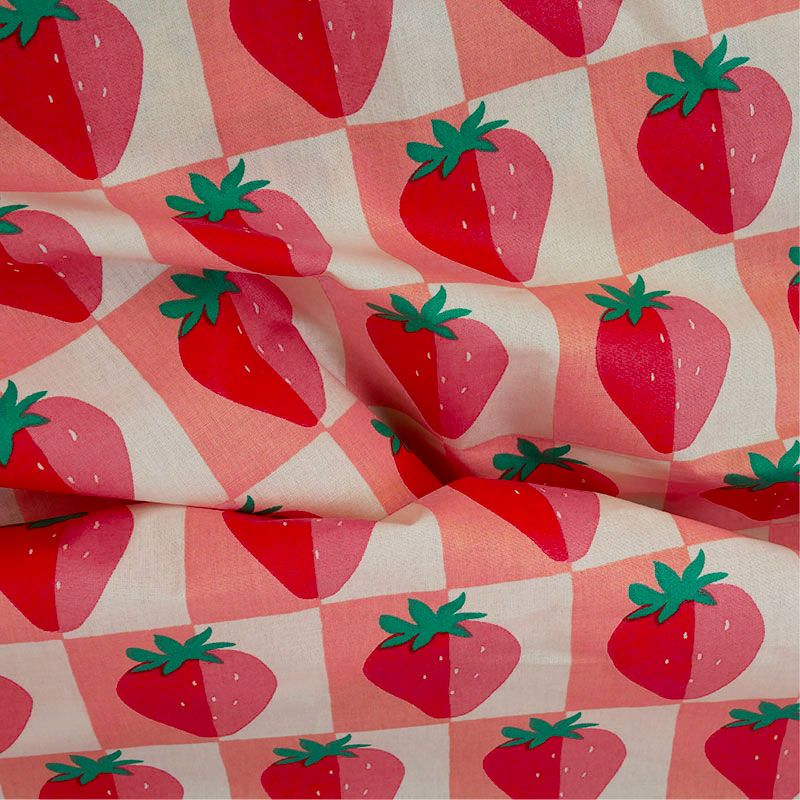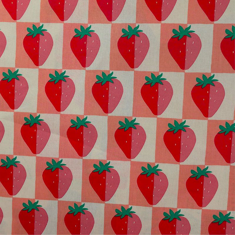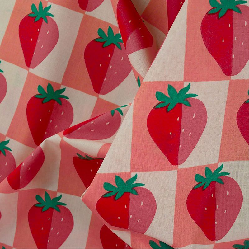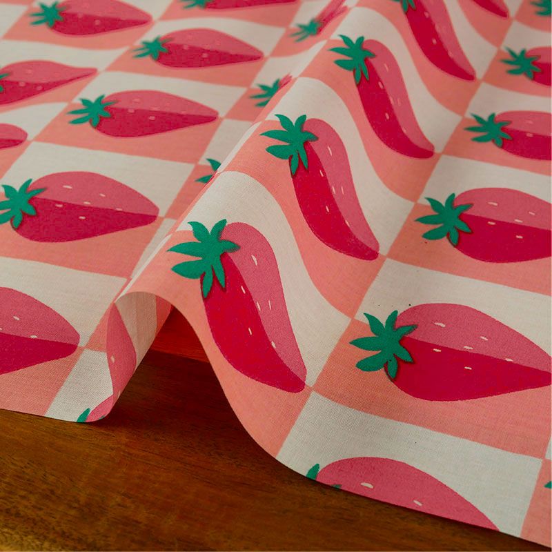 Craquez pour ce tissu en coton enduit aux adorables fraises sur fond damier rose et rouge, un imprimé à croquer qui mettra une touche fruitée et joyeuse dans tous vos projets couture.