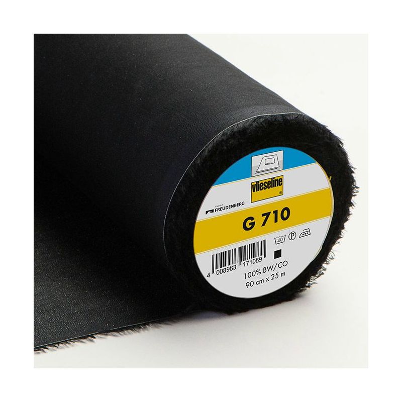 Le G710 noir de Vlieseline est un entoilage thermocollant tissé, souple et fin, idéal pour les petits empiècements sur tissus légers à moyens de couleur foncée.