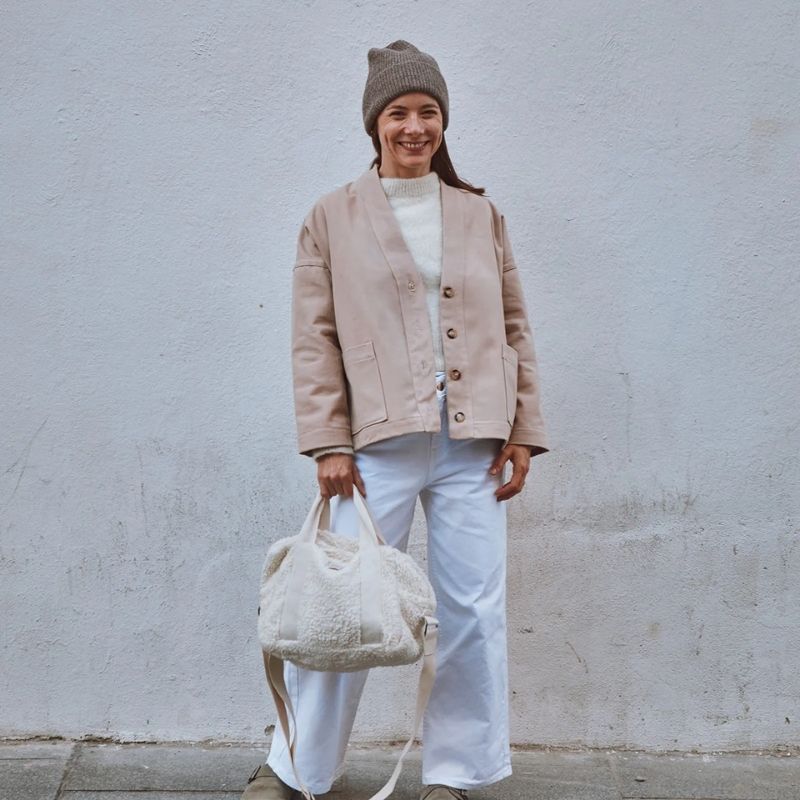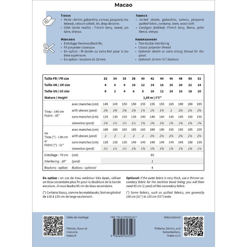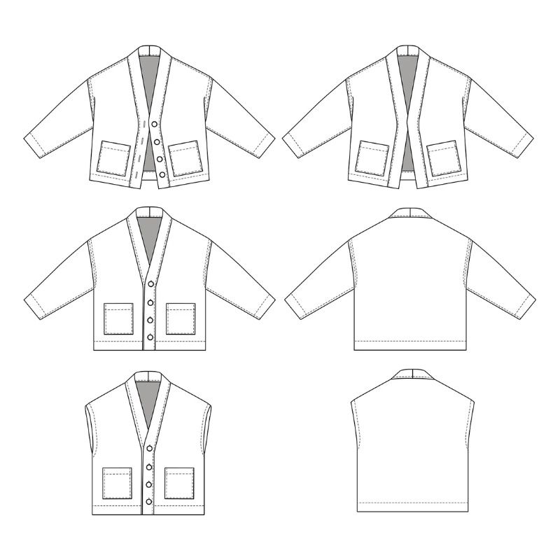 Macao est un patron de veste ou gilet au volume ample, proposé en version manches longues ou sans manches. Inspiré de l’esthétique japonaise, il est confortable, structuré et facile à assortir.