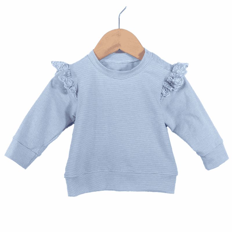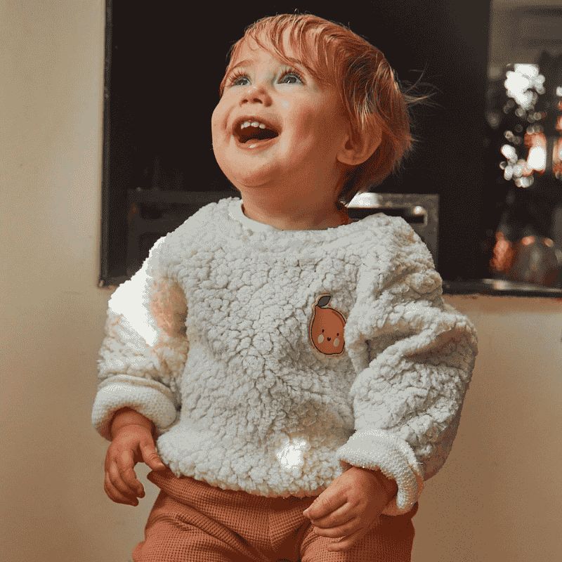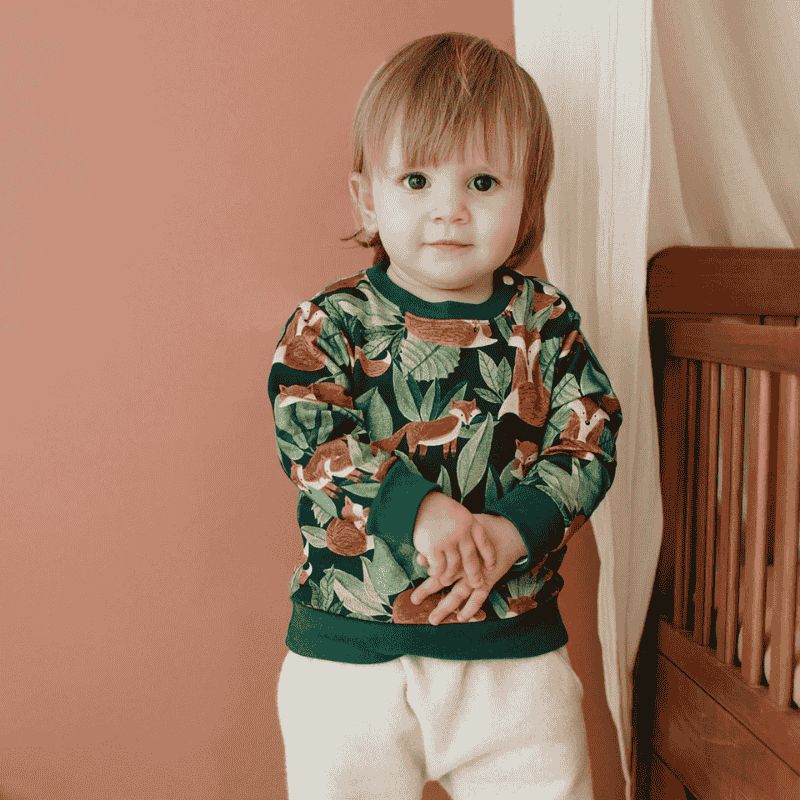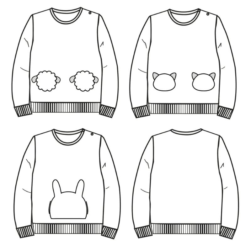 Patron de sweat bébé mixte avec patte de boutonnage à l’épaule. Options de poches décoratives (chat, mouton, kangourou) et volants. Finitions en bord-côte.