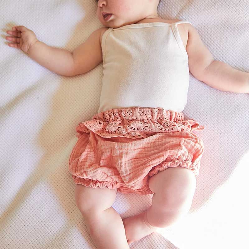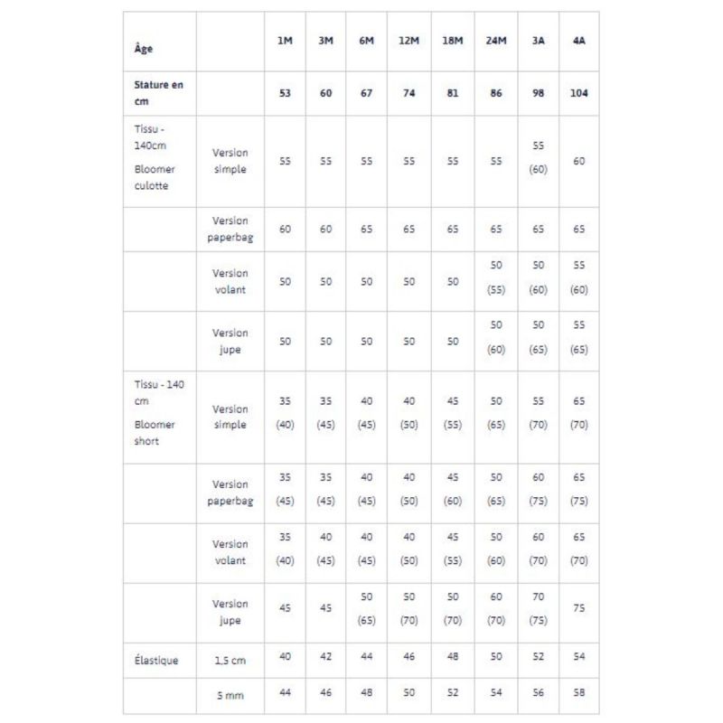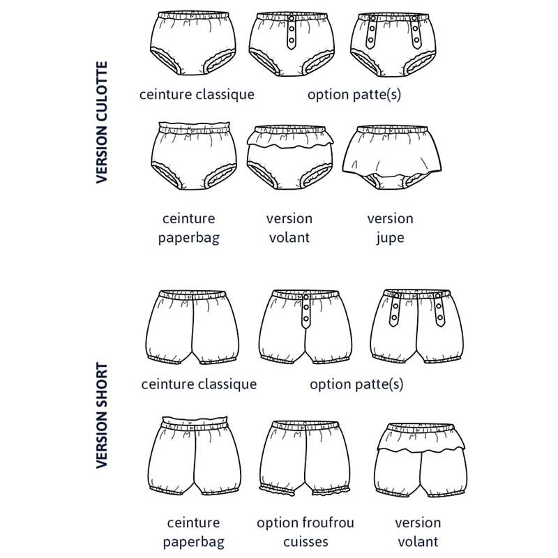 Patron de couture pour confectionner d'adorables bloomers pour vos tout-petits. Diverses versions vous sont proposées : forme culotte ou short, à bretelles amovibles optionnelles, avec volants ou jupe à la taille, avec pattes boutonnées décoratives, etc. Ce patron mixte est à décliner dans différentes formes et matières.