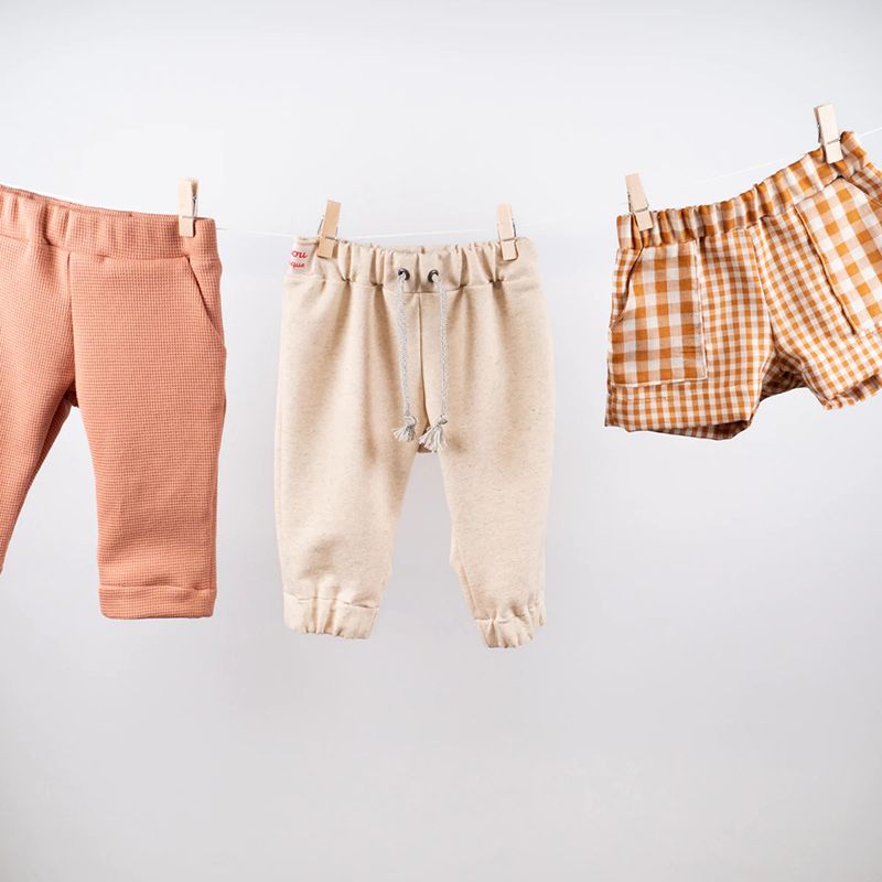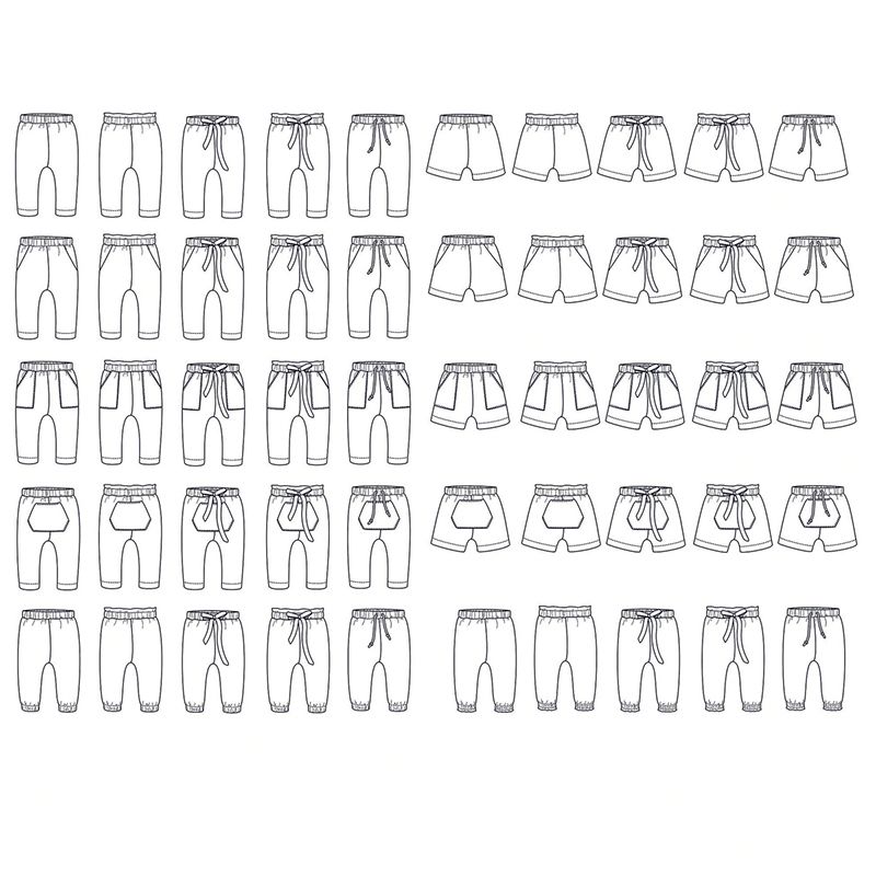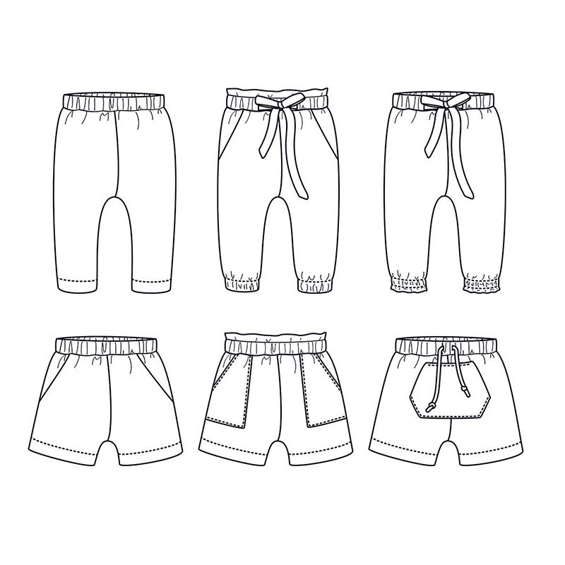 Adorable pantalon pour bébé et enfants, qui se décline également en short. Plusieurs options de ceinture ( classique, paperbag, avec une bande à nouer), de poches (italiennes, plaquées, kangourou), ainsi que d’ourlet (élastiqué, avec volant, classique).