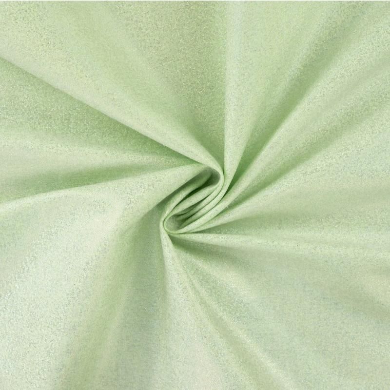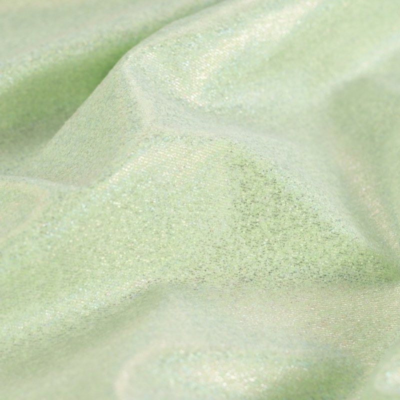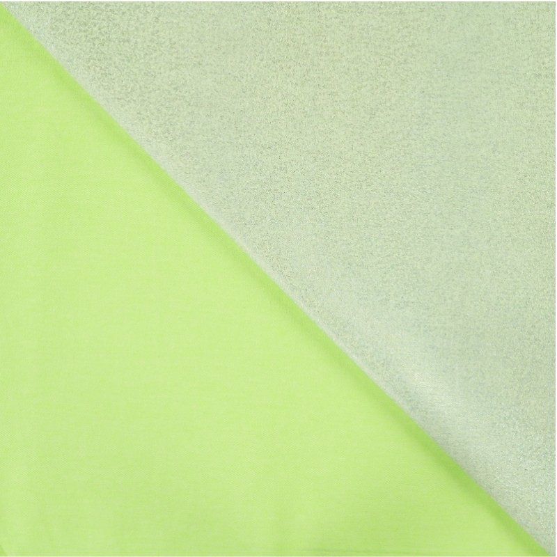 Les deux faces du tissu sont utilisables. La face endroit est pailletée, tandis que la face envers est unie, couleur vert pomme.