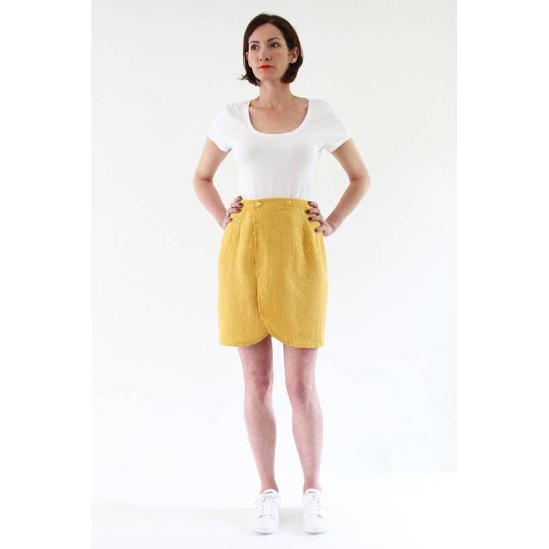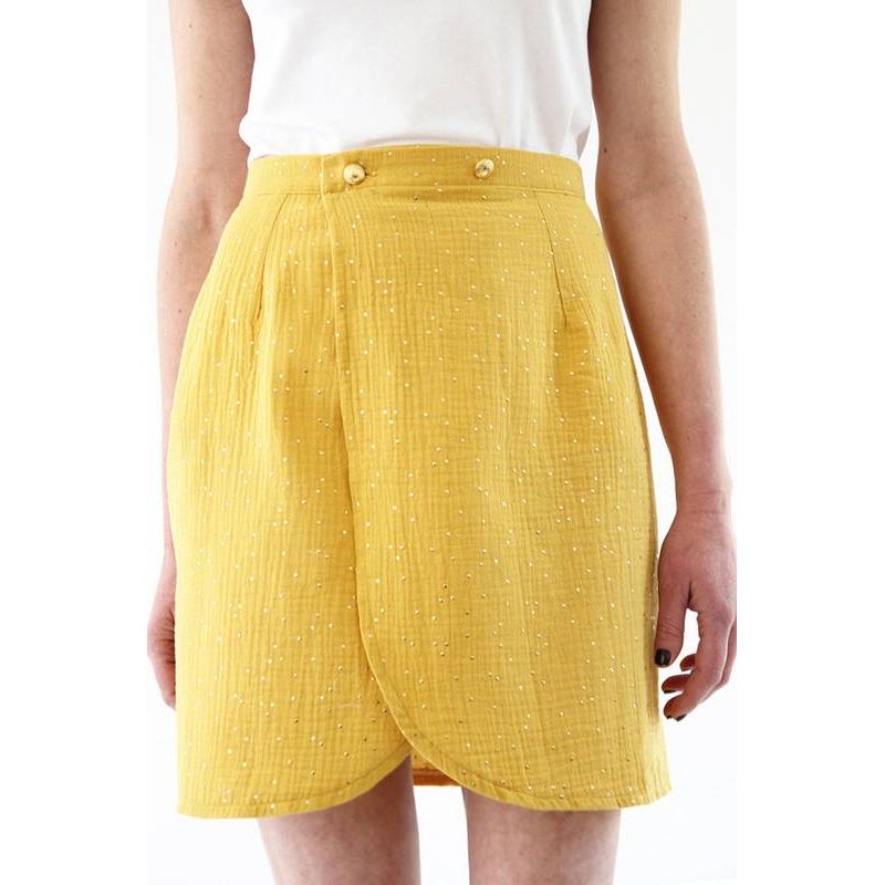Lancez-vous dans la couture de la jupe Malo de I am Patterns dans notre tissu double gaze à pois dorés.