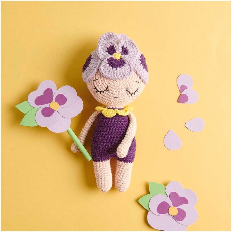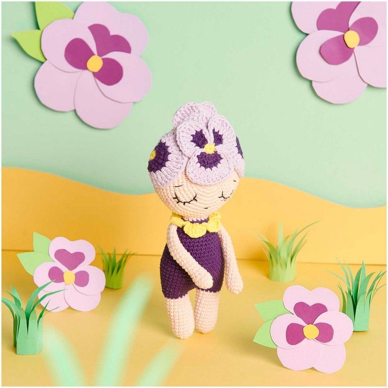 Ajoutez Pansy à votre collection d’amigurumis, une jolie poupée au crochet inspirée des pensées du jardin.