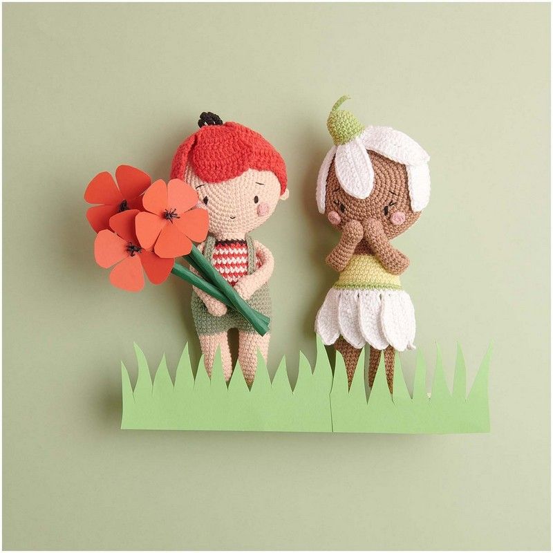 Avec son bonnet en forme de pétales rouges, sa petite salopette et son maillot à rayures, il ne manque pas de charme. Ce modèle, issu du livret Blooming Beauties de Rico Design, est idéal pour donner vie à une création unique et colorée.
