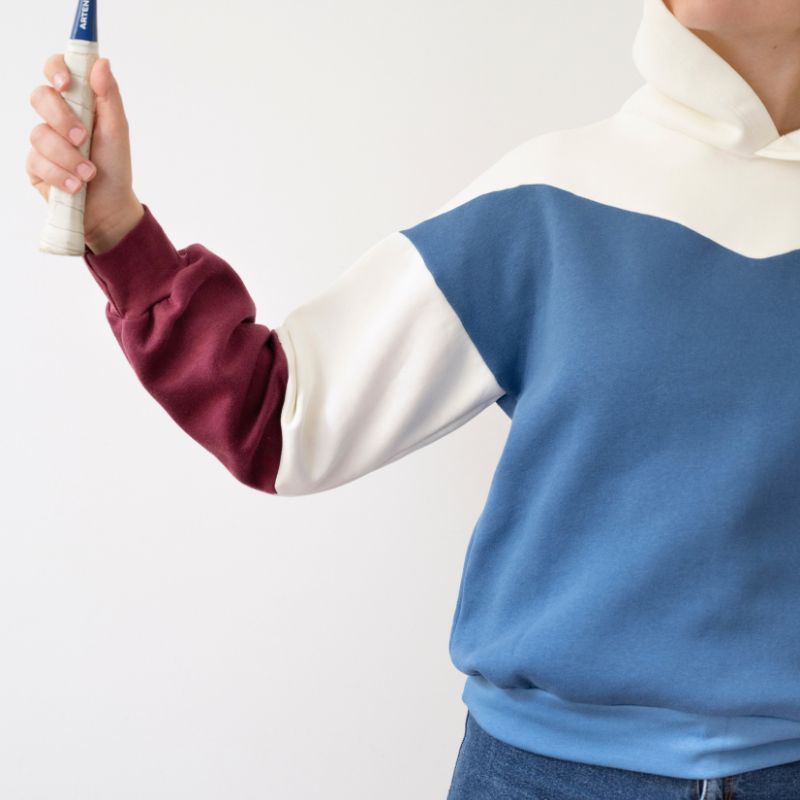 Ce modèle Arty, issu du livre Mon sweat-shirt à la carte, propose une coupe féminine et confortable. Les découpes structurent le vêtement et mettent en valeur les contrastes de couleurs. La capuche ajoute une touche casual, parfaite pour un look moderne et facile à porter.