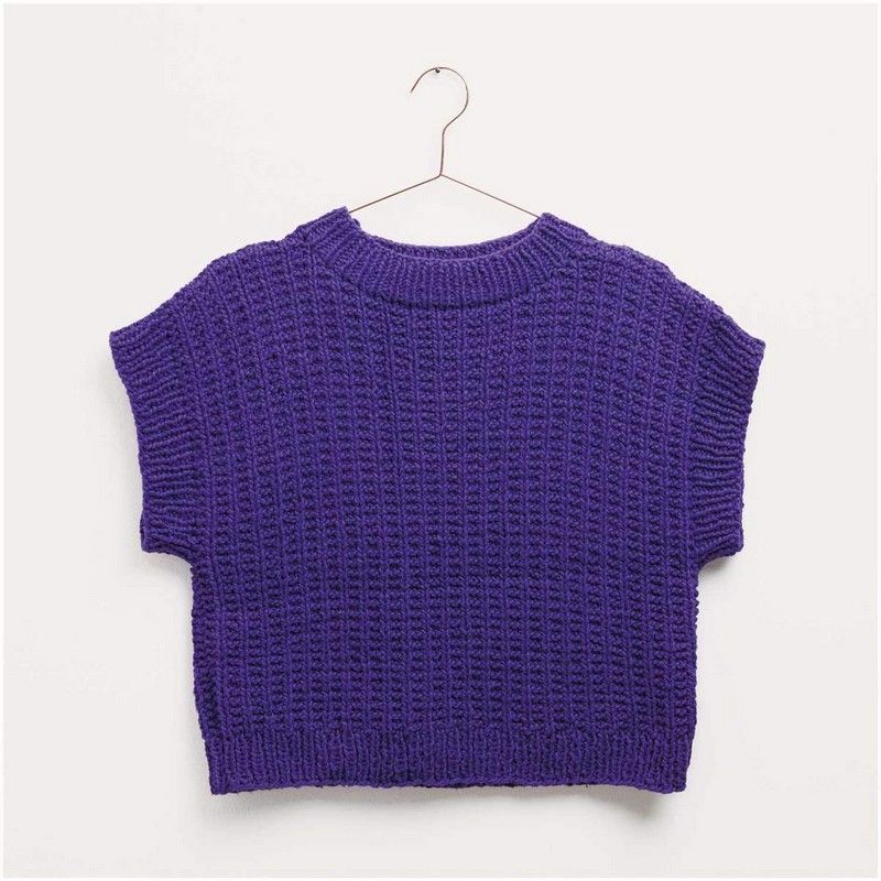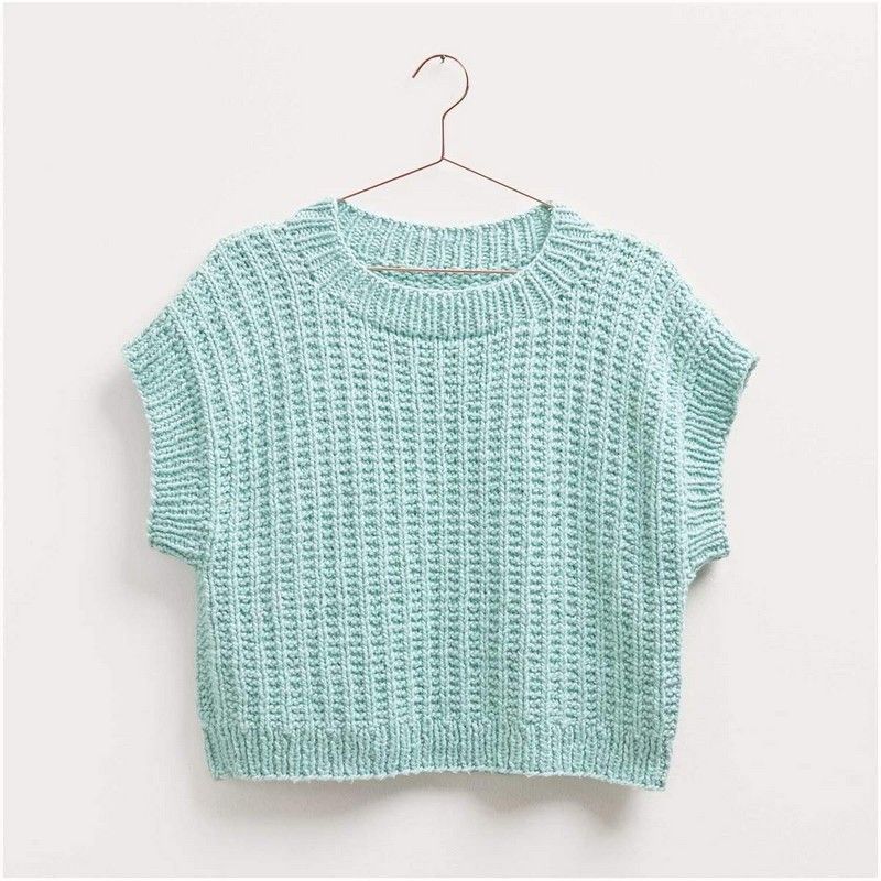 Craquez pour ce pull sans manches avec un effet Waou sur les épaules à tricoter en côtes 1/1.