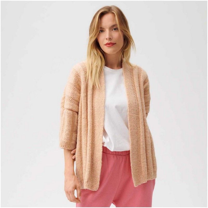 Enveloppez vous dans ce joli gilet couleur abricot aux subtiles paillettes.