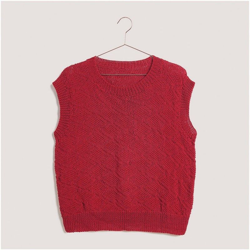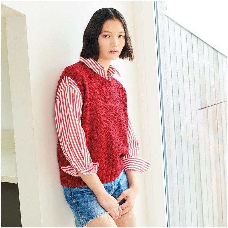 Le gilet pull en fil Essentials Cotton dk est bien plus qu'un simple vêtement : c'est une déclaration de style pour le printemps et l'été. Polyvalent et élégant, ce modèle peut être porté seul lors des journées plus chaudes ou associé à un chemisier pour une allure plus sophistiquée. Doté d'un motif de losanges tridimensionnels, ce gilet est un chef-d'œuvre de tricot qui attire les regards et séduit par son élégance intemporelle.
