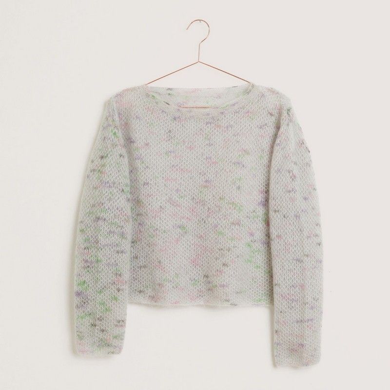 Ce pull, conçu pour les tricoteurs de niveau avancé, est réalisé avec le fil Essentials Super Kid Mohair Loves Silk Cute Confetti, offrant un aspect ludique et moucheté à votre création.