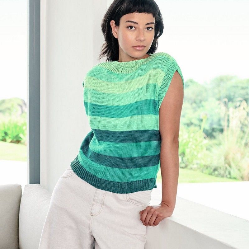 Tricotez un haut estival aux nuances subtiles de vert et de bleu, parfait pour apporter une touche de fraîcheur et d’originalité à votre dressing.