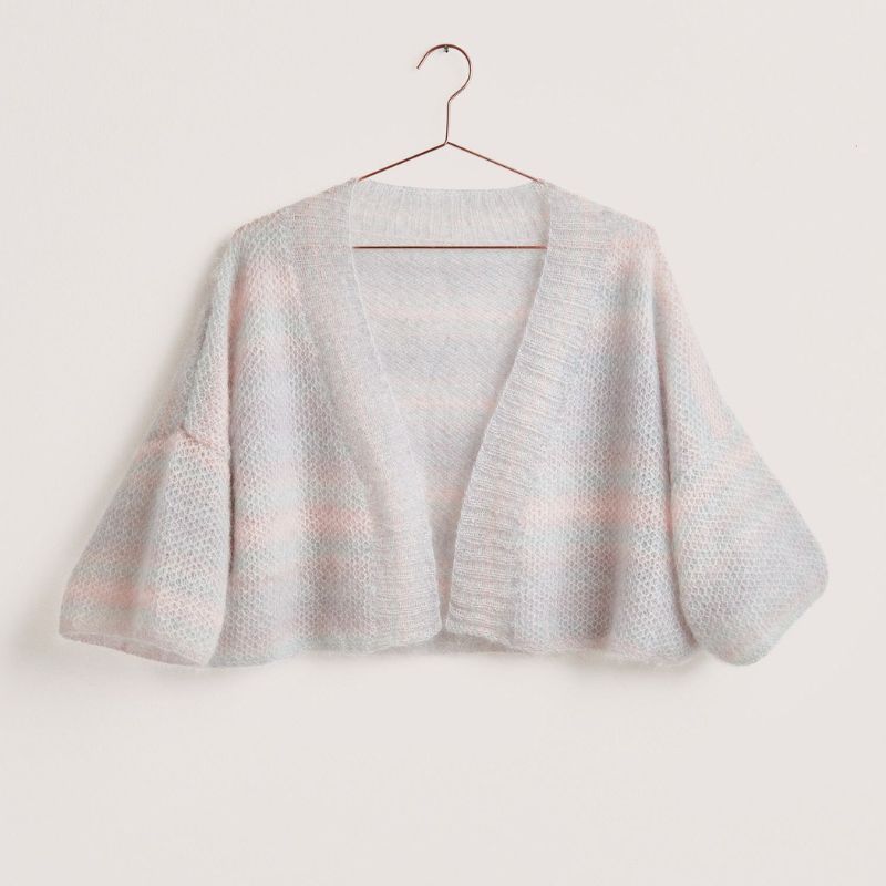 Tricoté dans le fil Essentials Super Kid Mohair Loves Silk Spray de Rico Design, il allie douceur, légèreté et un effet vaporeux sublime. Son point alvéolé donne un joli aspect filet, idéal pour jouer sur la transparence et l’élégance. Facile à porter sur un débardeur ou une robe, ce cardigan devient un indispensable de votre dressing tricot.