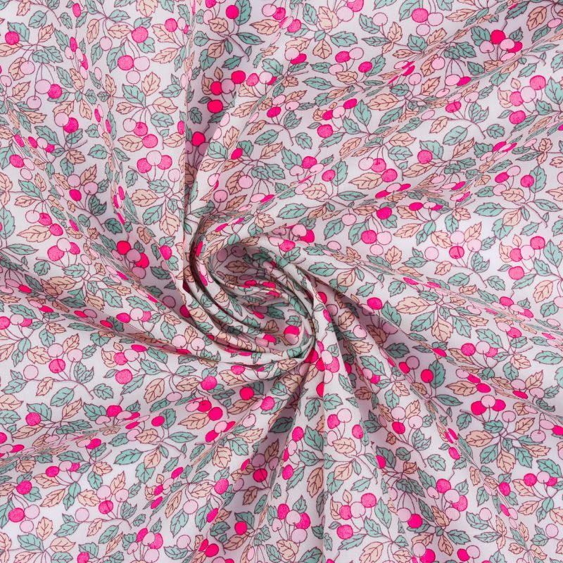 Peinte à la main en 1960 par Colleen Farr, fondatrice du premier studio de design interne de Liberty dans les années 1950, le motif représente de juteuses cerises d’été, suspendues à des branches feuillues. Un motif plein de fraîcheur et d’énergie, sublimé par cette version rose fluo incomparable.