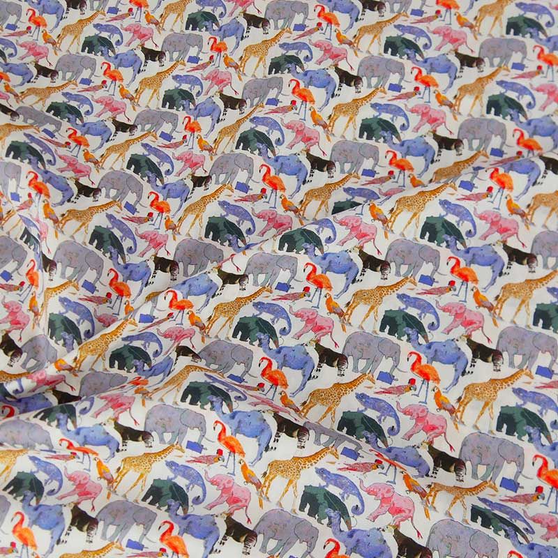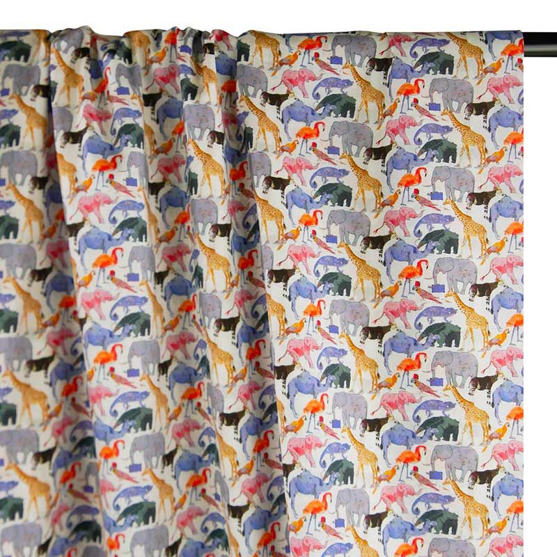 Tissu Liberty qualité Tana Lawn motif Queue for the zoo E de la célèbre marque anglaise Liberty of London aux adorables motifs d'animaux : girafes, éléphants, caméléon, perroquets...