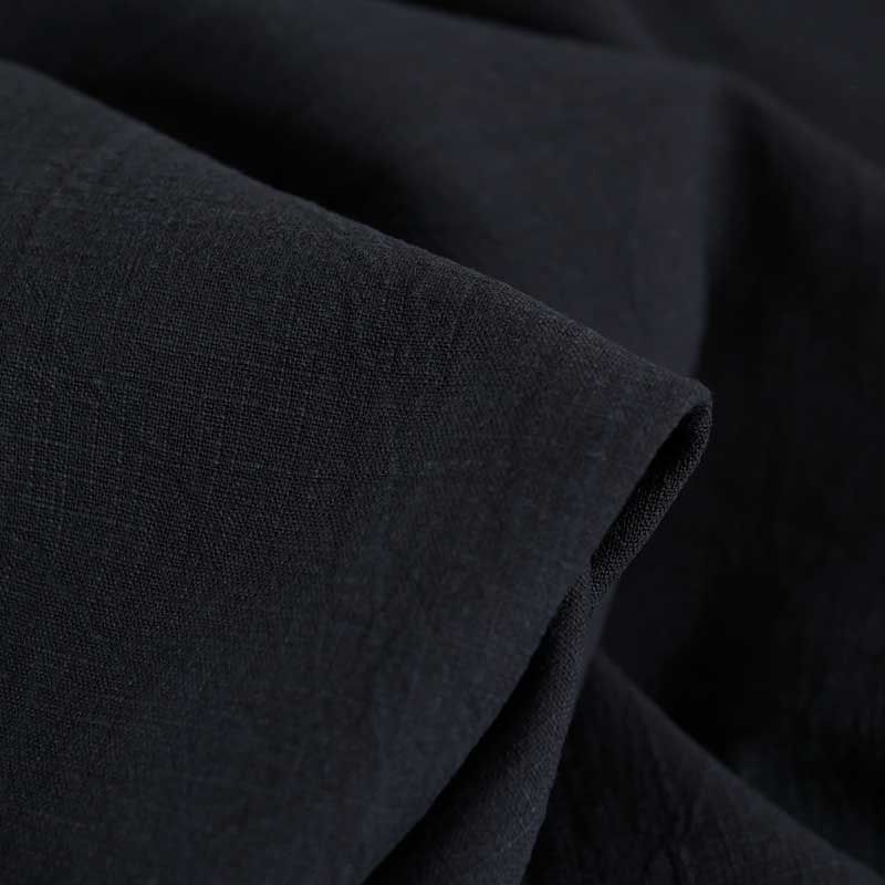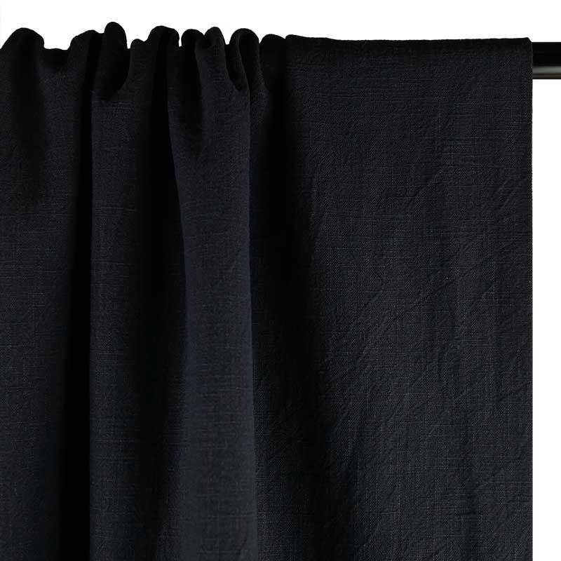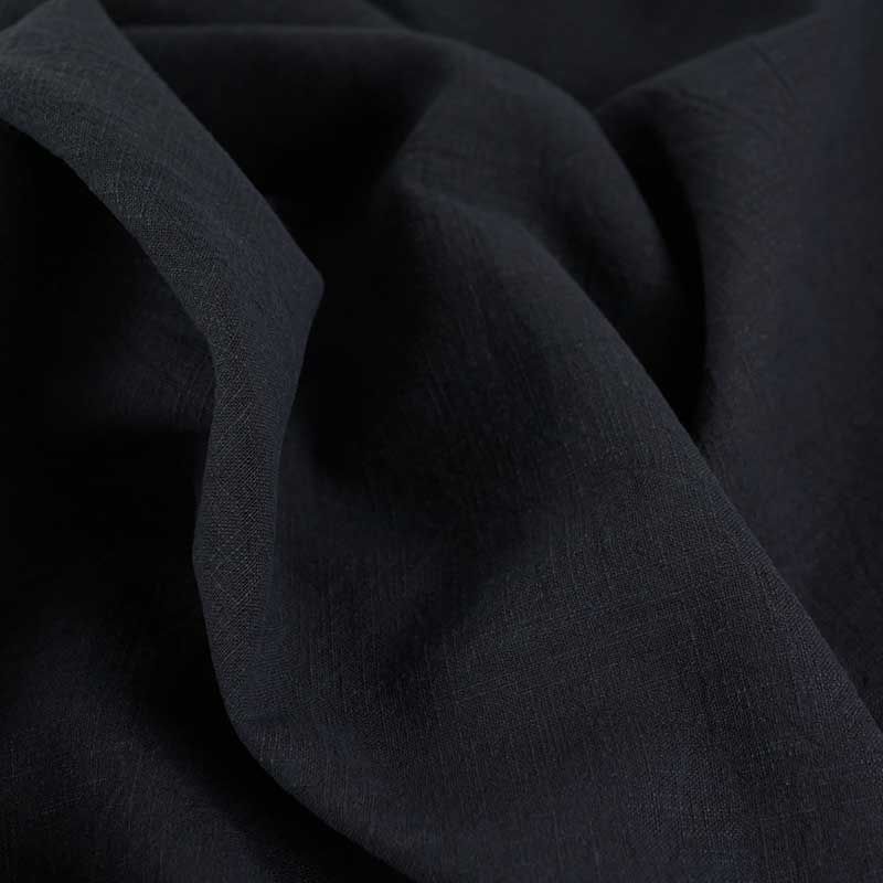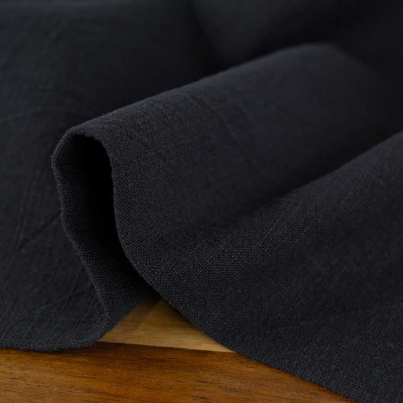 Tissu en lin lavé, de couleur unie bleu foncé, tirant vers le gris. Résistant à l'épreuve du temps, ce tissu se différencie par son aspect rustique et faussement froissé.