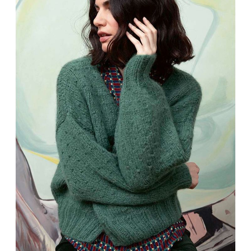 Son effet plumetis délicat et son tricot en côtes 2/2 et point de semis apportent à ce modèle un look à la fois moderne et intemporel.