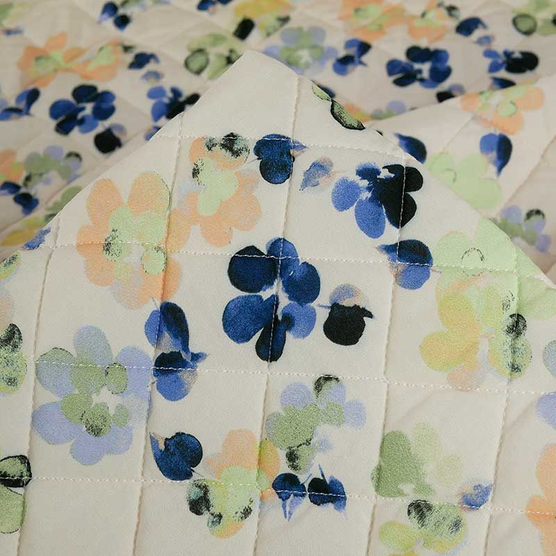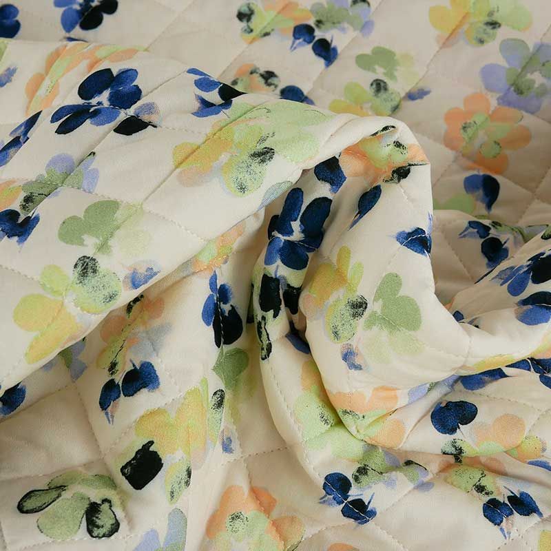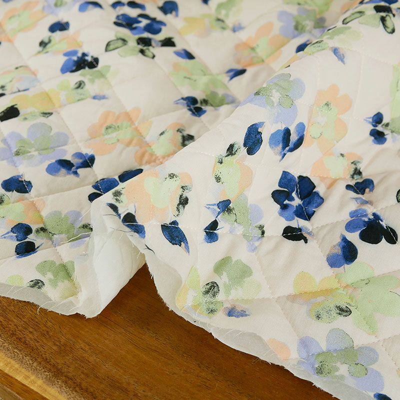 Issu d'un déstockage, ce tissu matelassé de très belle qualité, sera parfait pour créer de jolies pièces moelleuses et élégantes. Donnez une seconde vie à ce tissu, et profitez de ces délicats imprimés façon pochoirs, dans des teintes bleu marine, vert amande et orange clair.