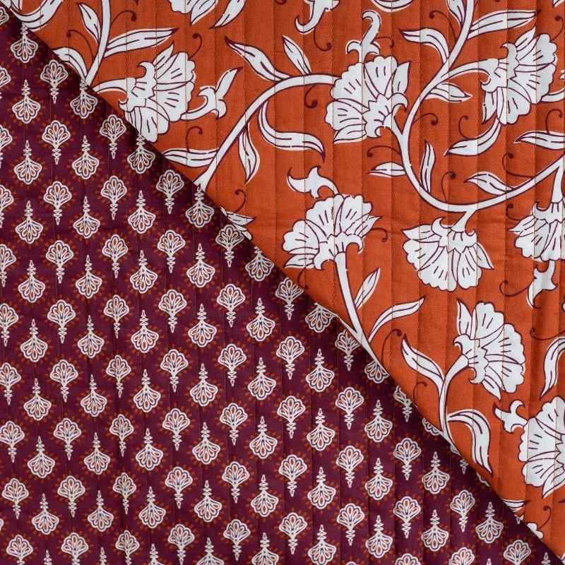 Très beau tissu matelassé, alliant du orange terracotta à du violet bordeaux. Un duo qui match à la perfection, sublimé par des motifs fleuris et ensoleillés.