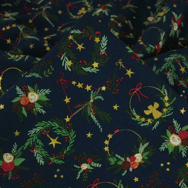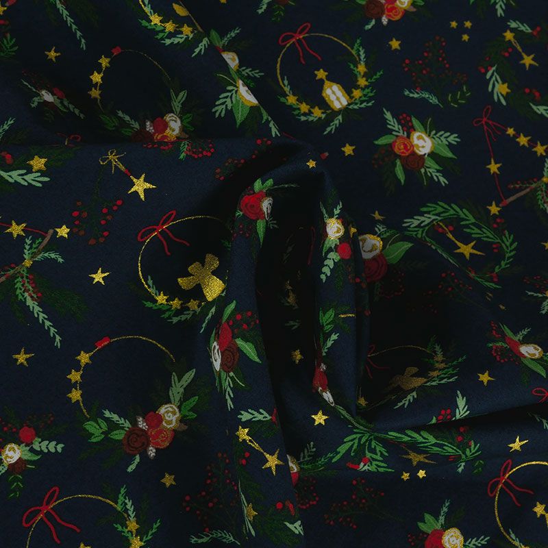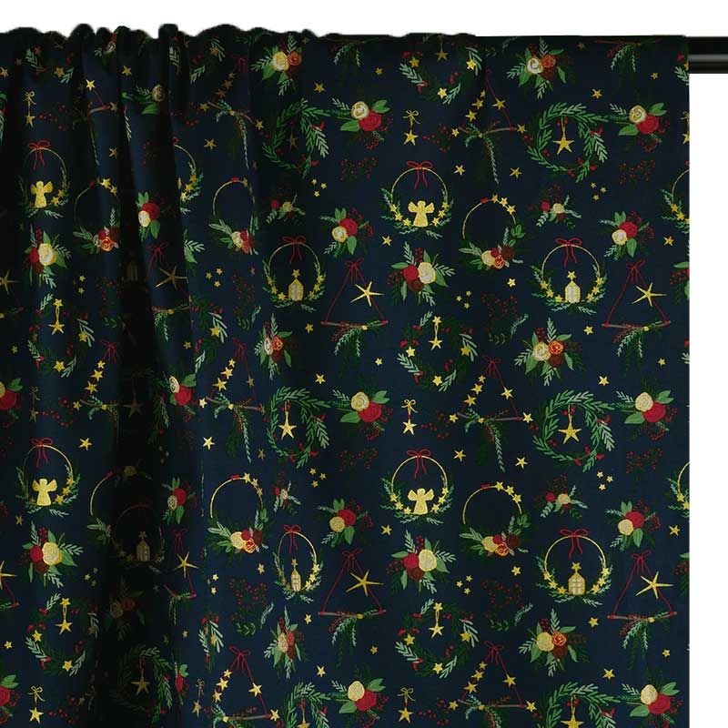Contemplez tous les détails de cette popeline de coton, recouverte de couronnes, bouquets et décorations murales. Un tissu inspirant, qui nous plonge instantanément dans l'esthétique festif de la fin d'année. Sur fond bleu marine, les motifs sont principalement verts et rouges, sublimés par des touches de doré scintillant.