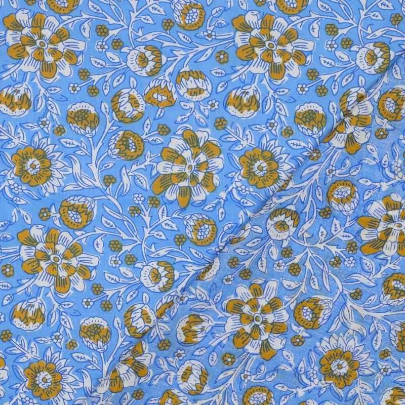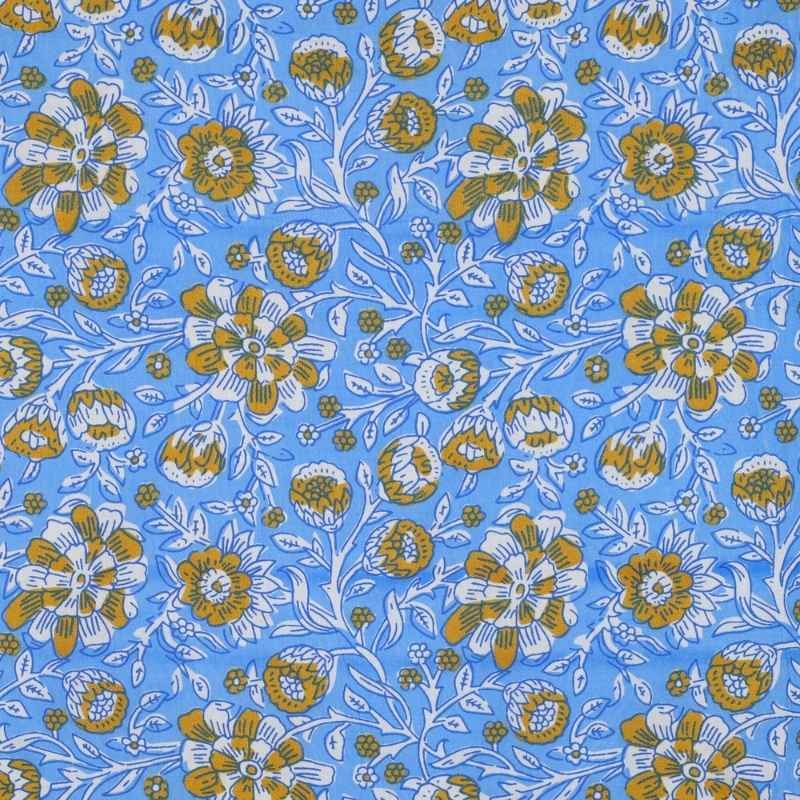Ce tissu séduit par son motif floral délicat et son fond lumineux bleu ciel ensoleillé. Imprimé à la main selon la technique traditionnelle du block print, il offre un rendu authentique et légèrement irrégulier qui fait tout son charme.