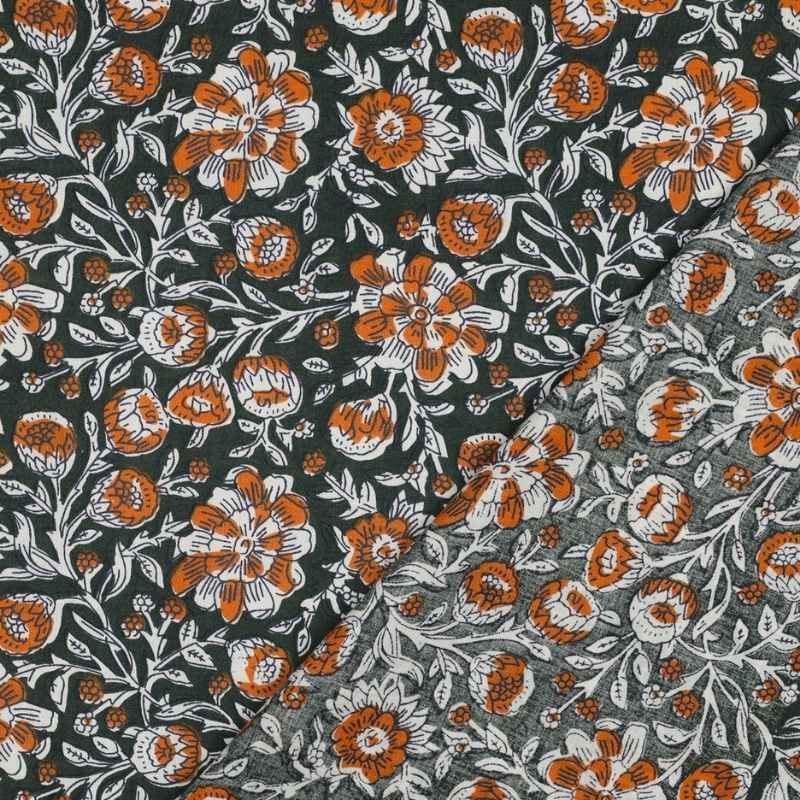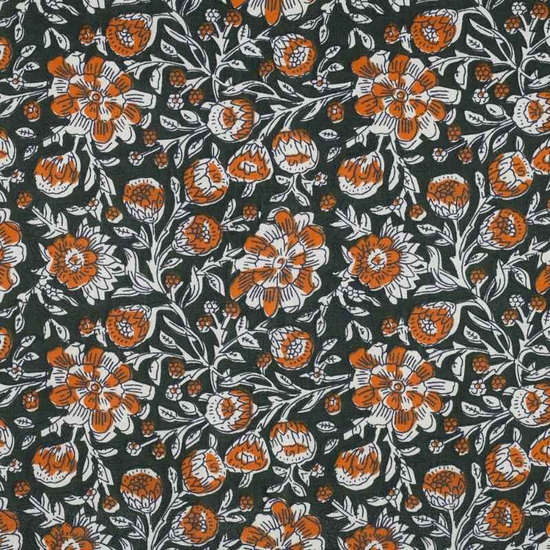 Ce tissu motif indien Eloria se distingue par son contraste élégant entre un fond vert foncé et des fleurs écrues et orange. Imprimé à la main selon la technique traditionnelle du block print, il offre un rendu vivant et authentique loin des impressions industrielles.