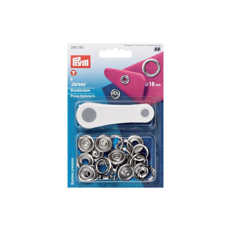 Boutons pressions jersey en métal argenté diamètre 18 mm de la marque Prym avec outil de pose.