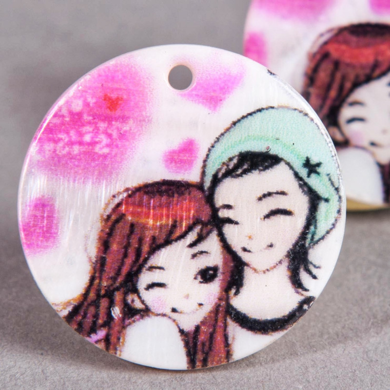 Pendentif sequin en nacre 25mm à motif couple kawaii x1