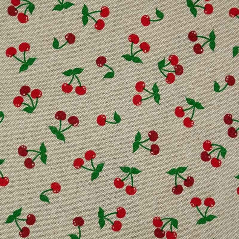 Tissu demi-natté effet lin à motifs cerises - beige