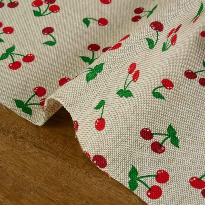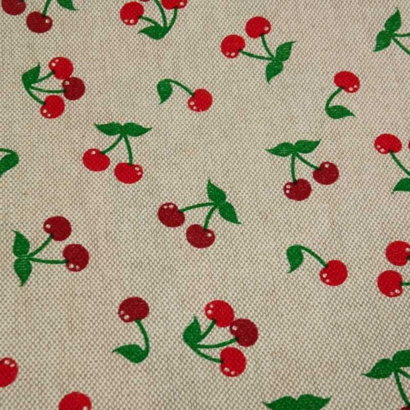 Ce tissu possède un aspect lin, ce qui lui donne un charme simple et naturel. Les motifs cerises sont imprimées sur un fond beige clair.