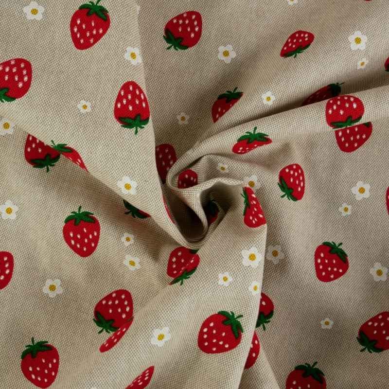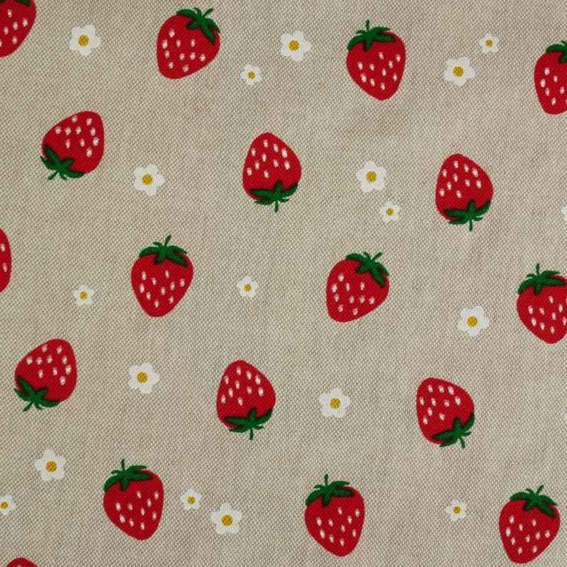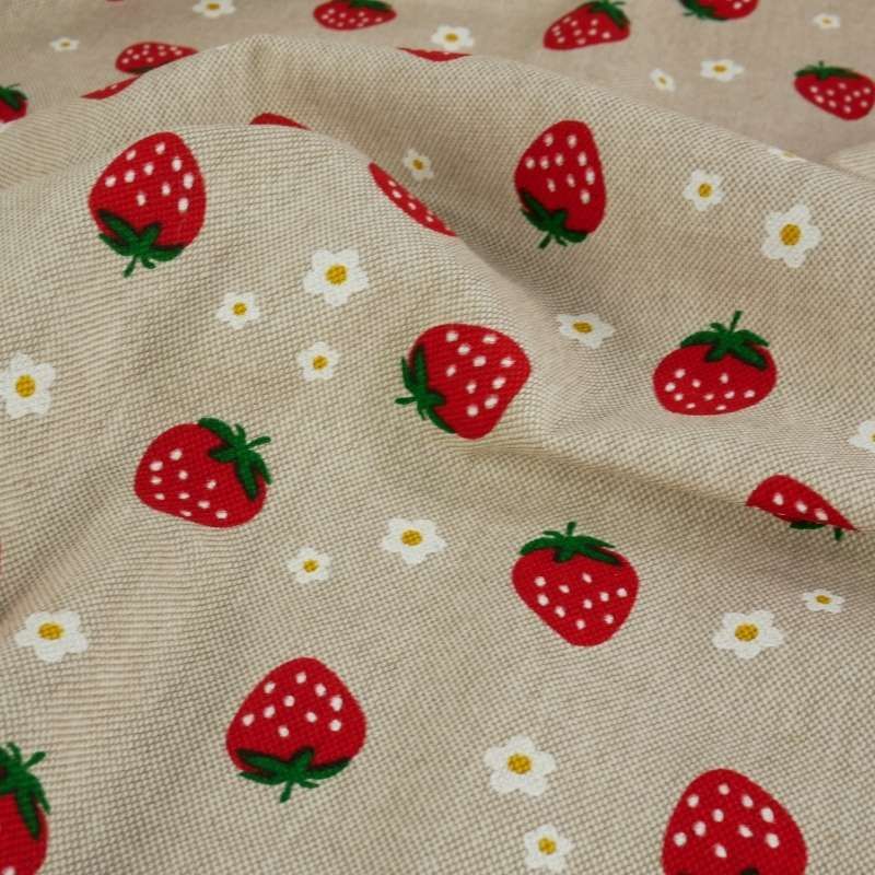 Tissu demi-natté canvas motifs fraises - beige x 10 cm