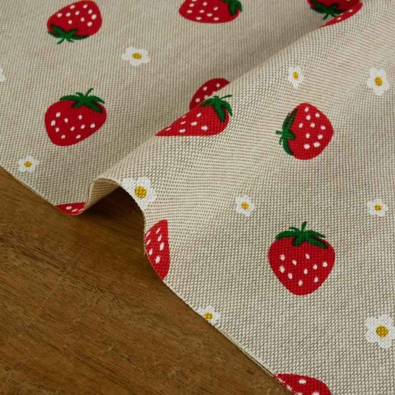 Il s'agit d'un tissu souple et robuste à la fois, recouvert d'un motif de fraises bien rouges, et de petites fleurs blanches.