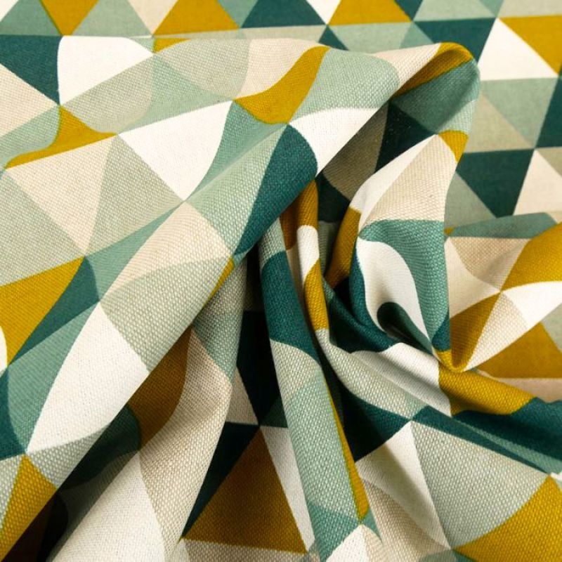 Toile coton effet lin motif triangles vert et moutarde pour sacs et ameublement