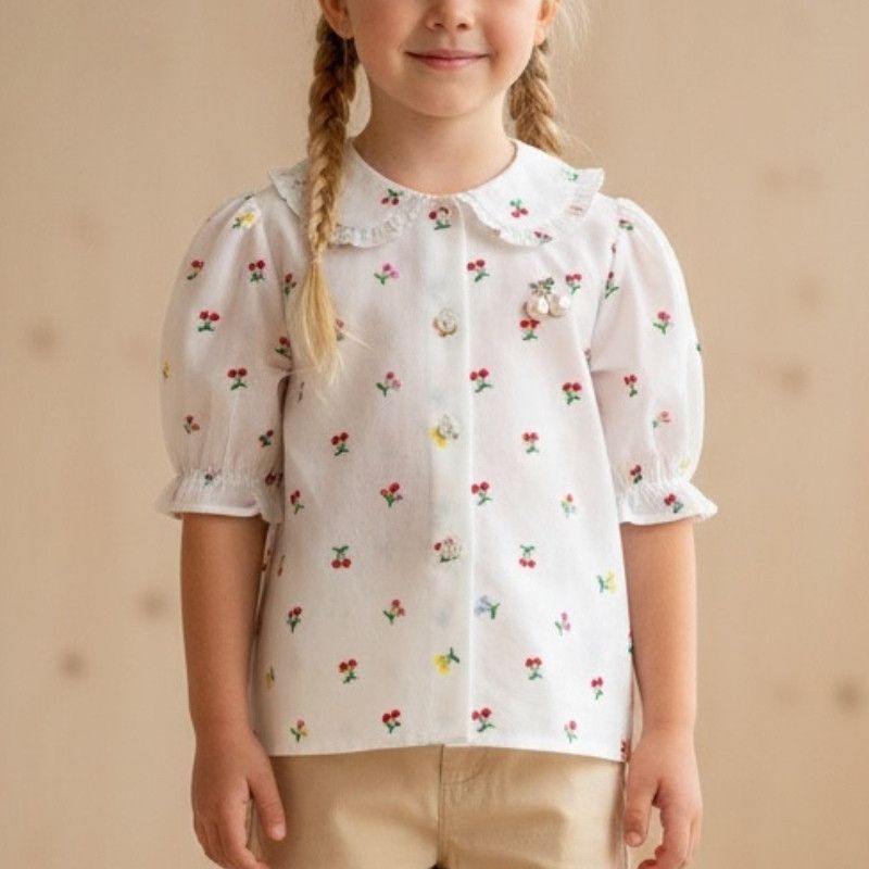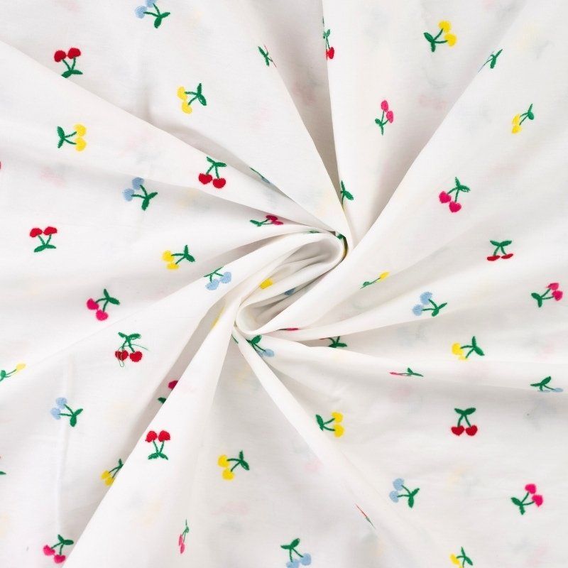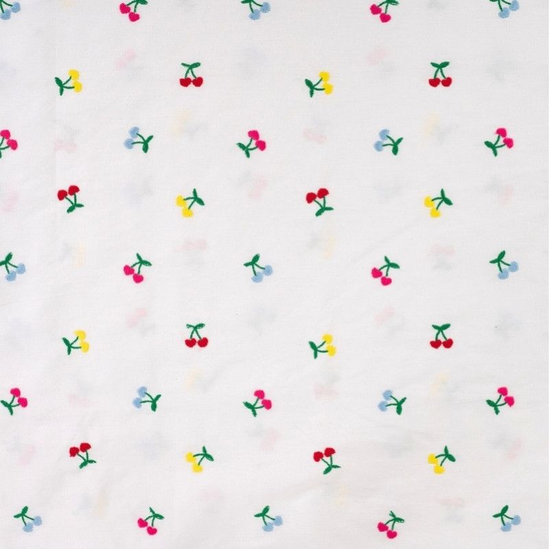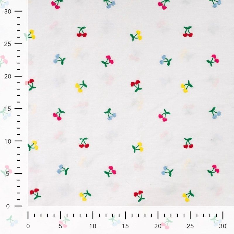 Voile de coton blanc, tapissé de petites cerises brodées. Ce qui rend ce tissu encore plus beau ? La palette de couleurs des broderies, allant du rose fuchsia au rouge, en passant par du jaune et du bleu ciel.