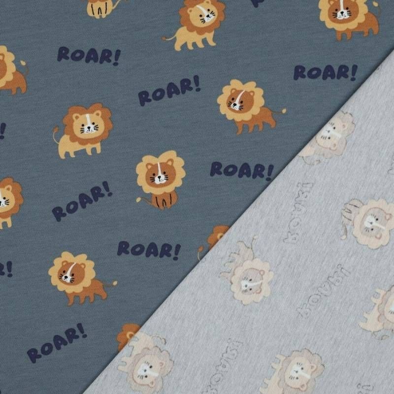 Ce tissu en jersey est parfait pour coudre des vêtements confortables et pleins de douceur. Son motif d’adorables petits lions, accompagné du texte Roar !, apporte une touche ludique et moderne sur un fond bleu de gris intemporel.