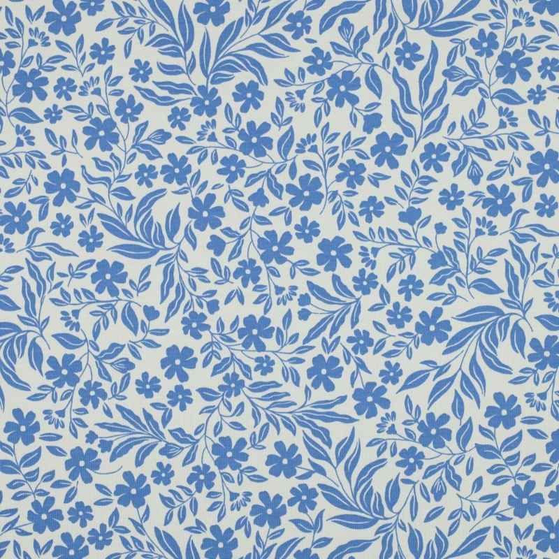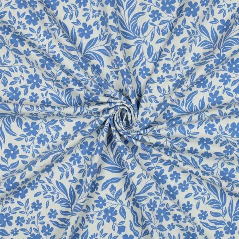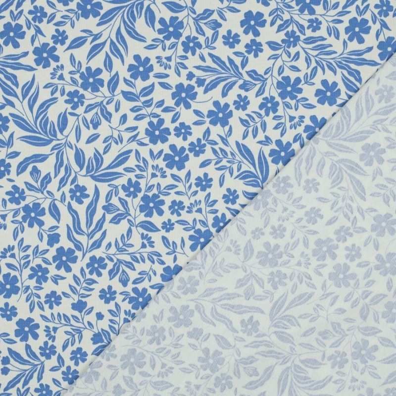 Jersey de coton Oeko-Tex fleuri bleu et blanc cassé