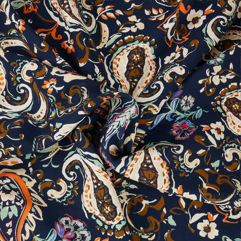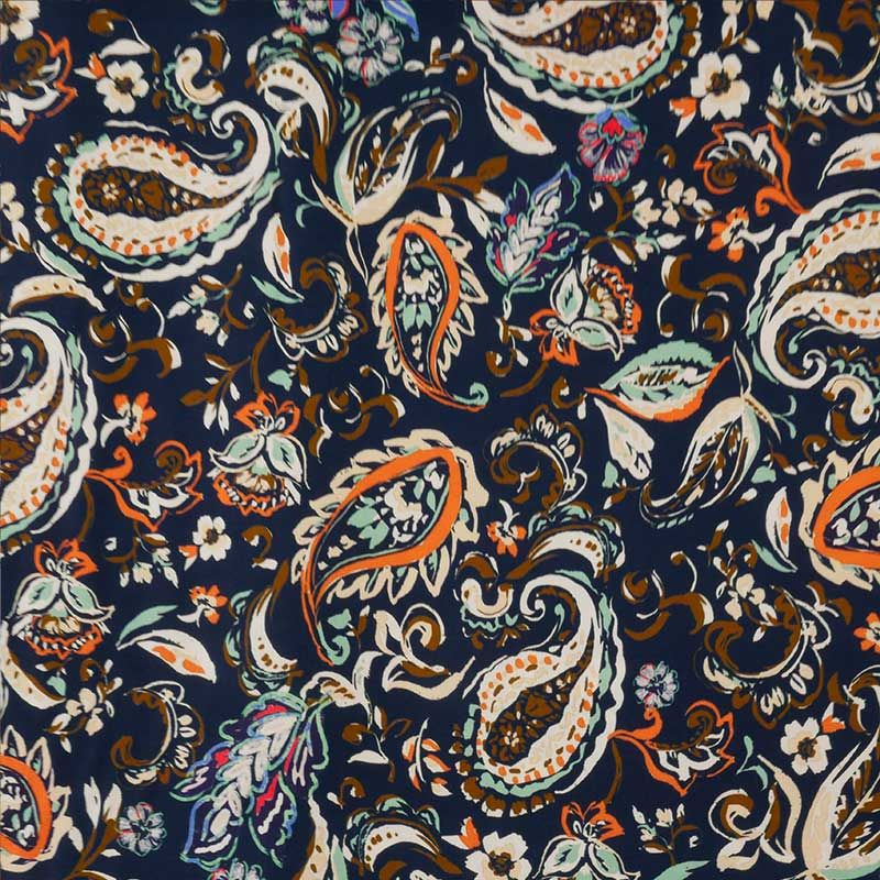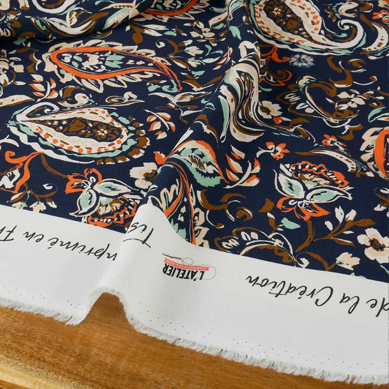 On tombe complètement sous le charme de notre imprimé Paislo... Sur un fond bleu marine, de grands motifs Paisley abstraits et des fleurs, dans les tons écru, orange, marron, vert céladon, bleu lavande et rouge.