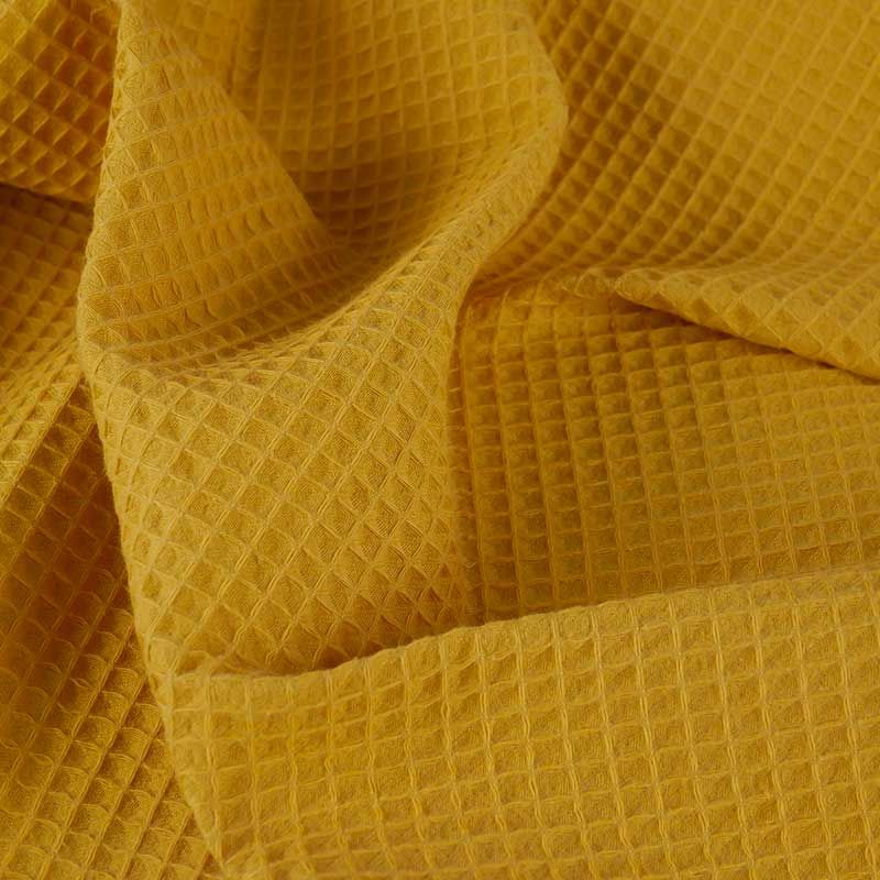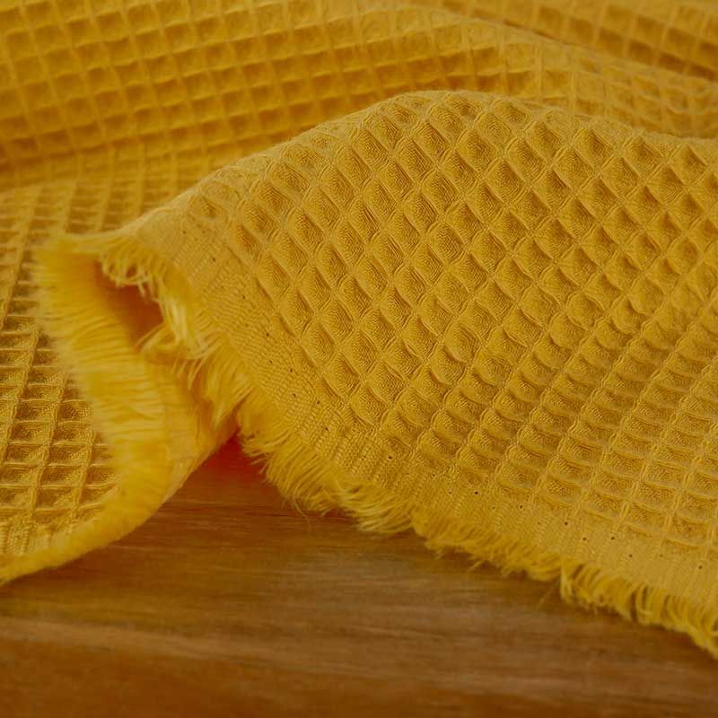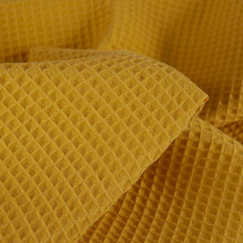 Léger et moelleux, le piqué de coton possède une texture en relief en forme de petits carrés, obtenus grâce à un tissage en nid d'abeille. Sa couleur est un jaune moutarde lumineux.
