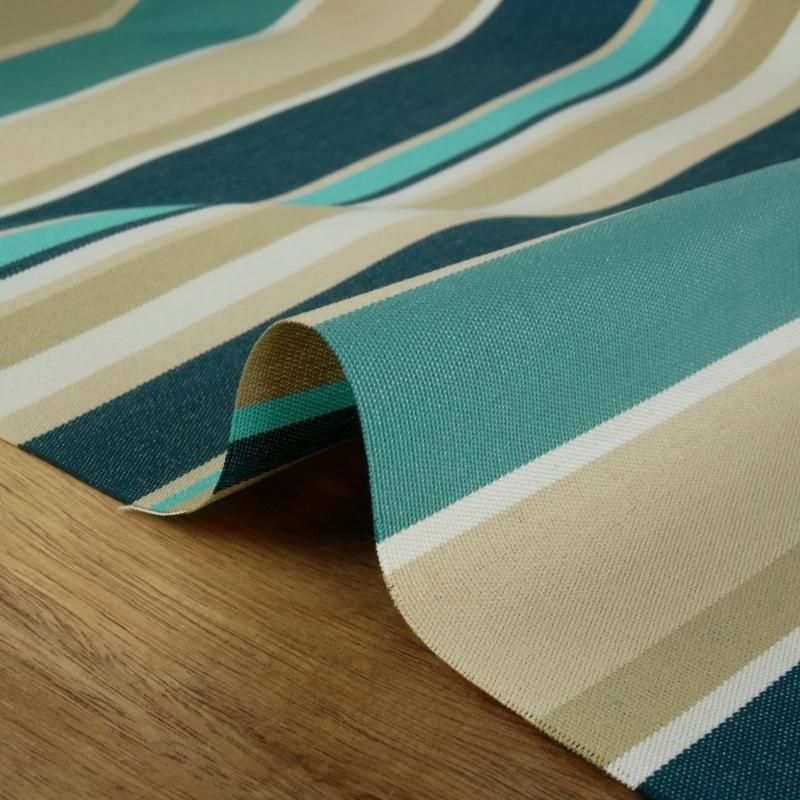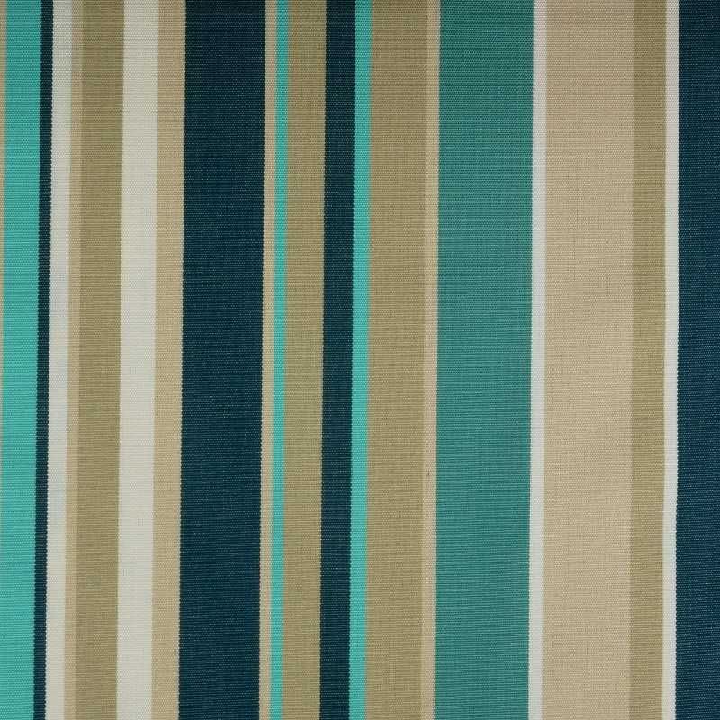 Toile d'extérieur, de grande qualité, à rayures beiges, bleu pétrole et bleu turquoise.