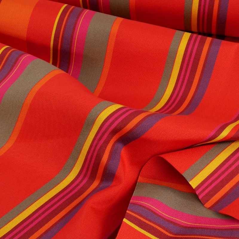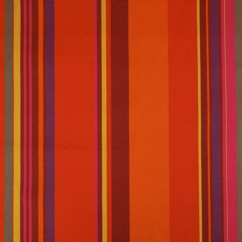 Très jolie toile d'extérieur, aux couleurs ensoleillées. Principalement rouge, le tissu est également rayé de bandes orange, jaunes, rose, grises, violettes, et bordeaux.