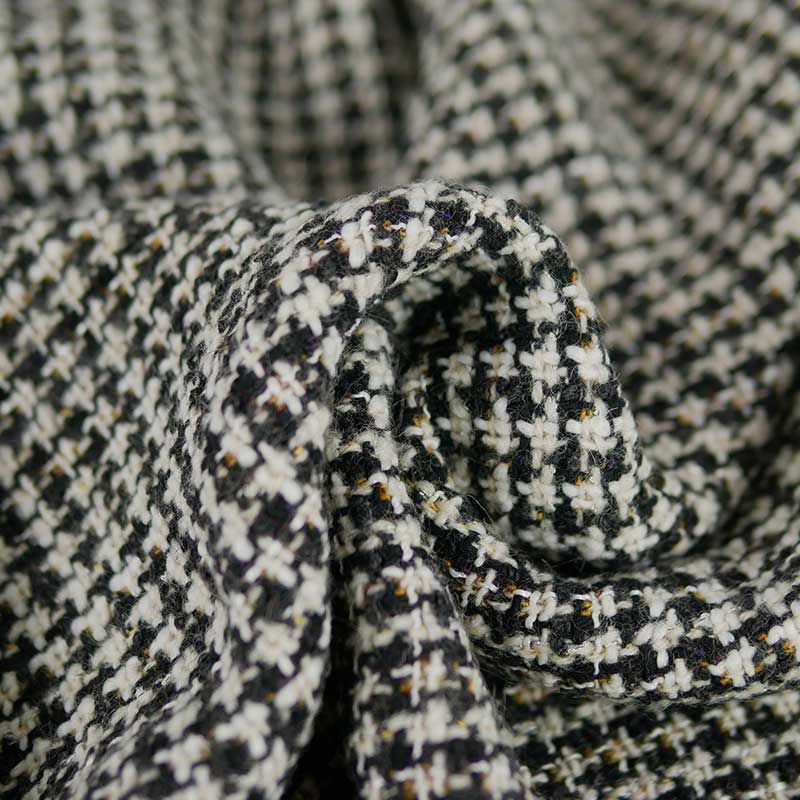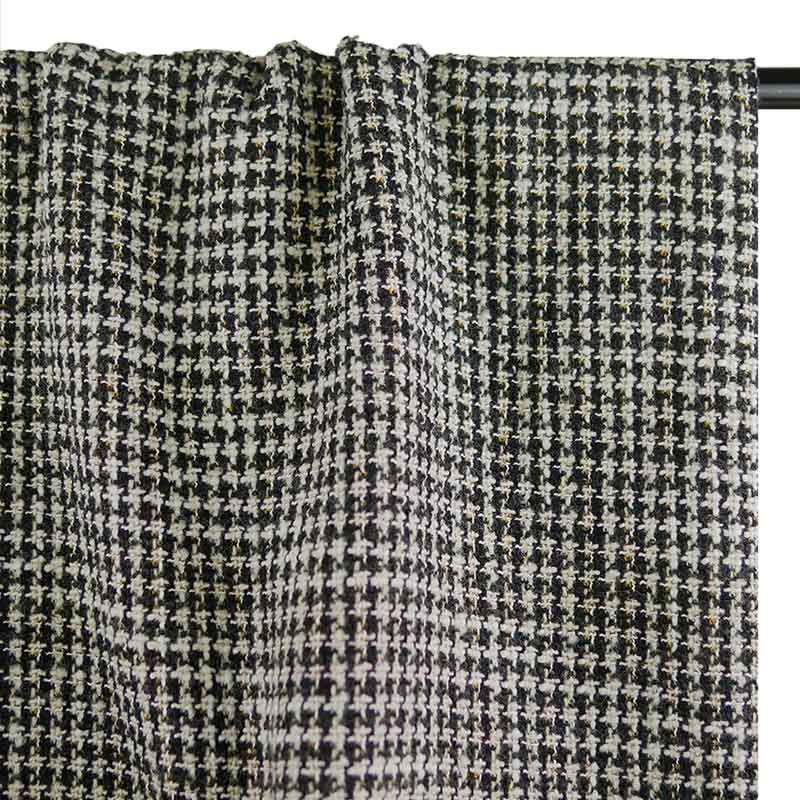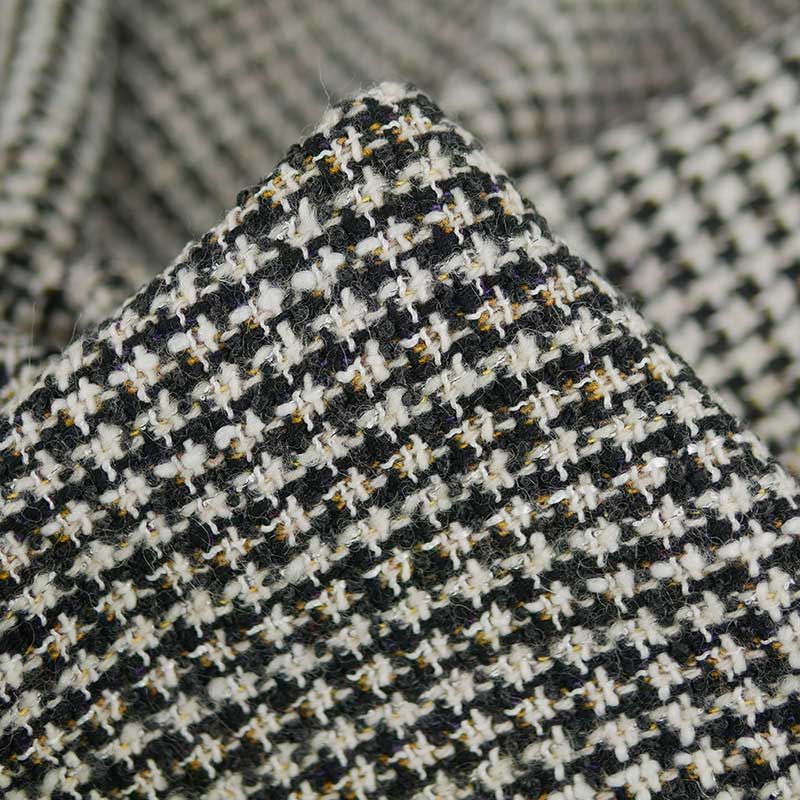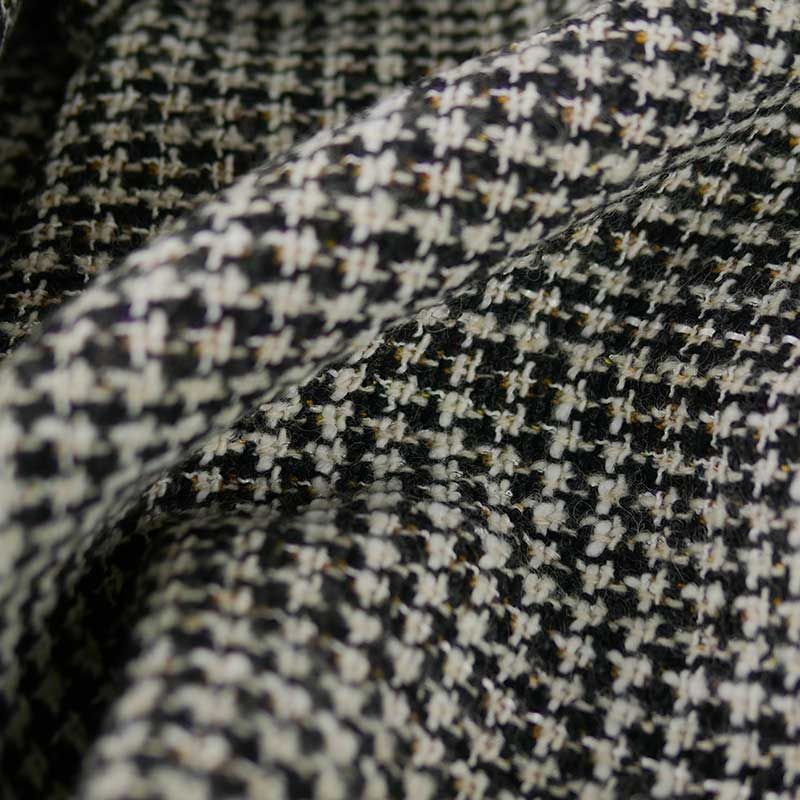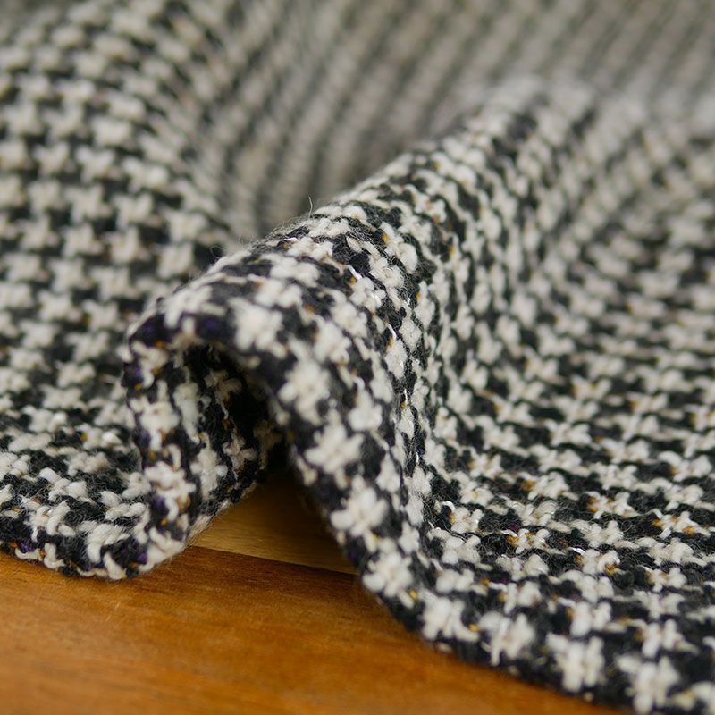 Optez pour deux lainages en un, avec ce tissu réversible. En effet, ce tissu a la particularité de présenter deux faces très différentes : l'une est dotée d'un quadrillage noir et écru (effet pied-de-poule), tandis que l'autre est composée de rayures alternant des fils noirs, violet foncé, jaune ocre et écrus.