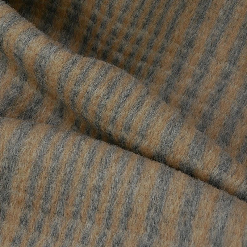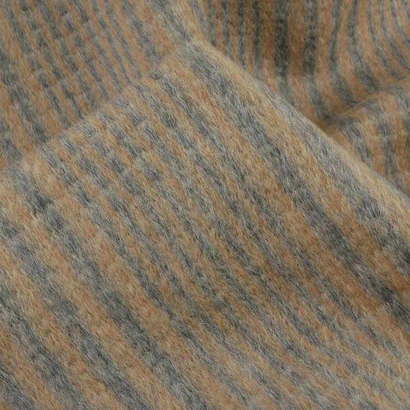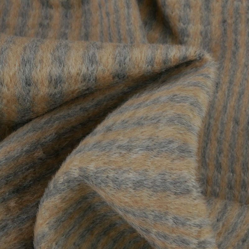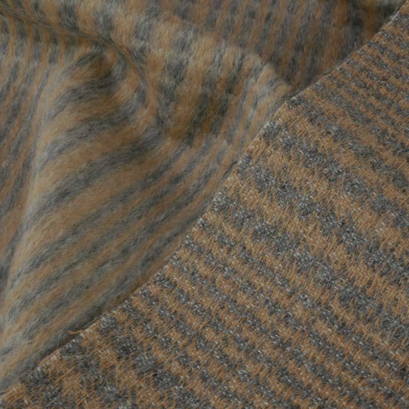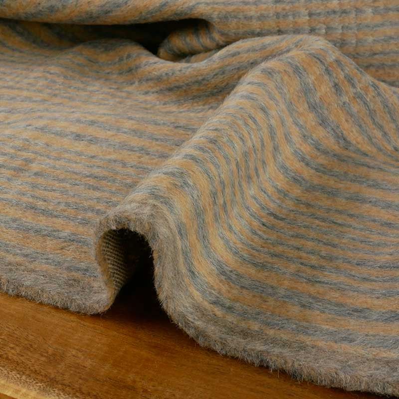 Très beau lainage à rayures, à la texture duveteuse. Ce tissu 100% laine est recouvert de poils courts, ce qui lui donne un aspect flou et ultra chic. Un mélange subtil de gris clair et orange clair, tirant vers le camel.